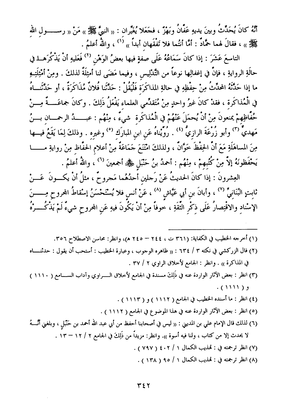 مَهديٍّ (¬3) وأبو زُرْعَةَ الرازِيُّ (¬4). رُوِّيْناهُ عَنِ ابنِ المبارَكِ (¬5) وغيرِهِ. وذلكَ لِمَا يَقَعُ فيها مِنَ المساهَلَةِ مَعَ أنَّ الحِفْظَ خَوَّانٌ، ولذلكَ امْتَنَعَ جَمَاعَةٌ مِنْ أعلامِ الحفَّاظِ مِنْ روايةِ ما يَحْفَظونَهُ إلاَّ مِنْ كُتُبِهِمْ، مِنْهُم: أحمدُ بنُ حَنْبَلٍ - رضي الله عنهم - أجمعينَ (¬6)، واللهُ أعلمُ.