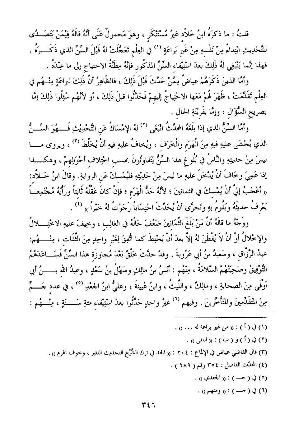 وأمَّا السِّنُّ الذي إذا بلَغَهُ المحدِّثُ انْبَغَى (¬2) لهُ الإمْسَاكُ عَنِ التَّحْدِيْثِ فَهُوَ السِّنُّ الذي يُخْشَى عليهِ فيهِ مِنَ الْهَرَمِ والْخَرَفِ، ويُخافُ عليهِ فيهِ أنْ يُخَلِّطَ (¬3)، ويروى ما ليسَ مِنْ حديثِهِ والنَّاسُ في بُلُوغِ هذا السِّنُّ يَتَفاوتُونَ بحسبِ اخْتِلافِ أحْوَالِهِمْ، وهكذا إذا عَمِيَ وخَافَ أنْ يُدْخَلَ عليهِ ما ليسَ مِنْ حَدِيْثِهِ فليُمْسِكْ عَنِ الروايةِ. وقالَ ابنُ خَلاَّدٍ: ((أعْجَبُ إليَّ أنْ يُمْسِكَ في الثمانينَ؛ لأنَّهُ حَدُّ الْهَرَمِ؛ فإنْ كانَ عَقْلُهُ ثَابِتاً ورَأْيُهُ مُجْتَمِعاً يَعْرِفُ حديثَهُ ويَقُومُ بهِ وتَحرَّى أنْ يُحَدِّثَ احْتِسَاباً رَجَوْتُ لهُ خَيْراً)) (¬4).