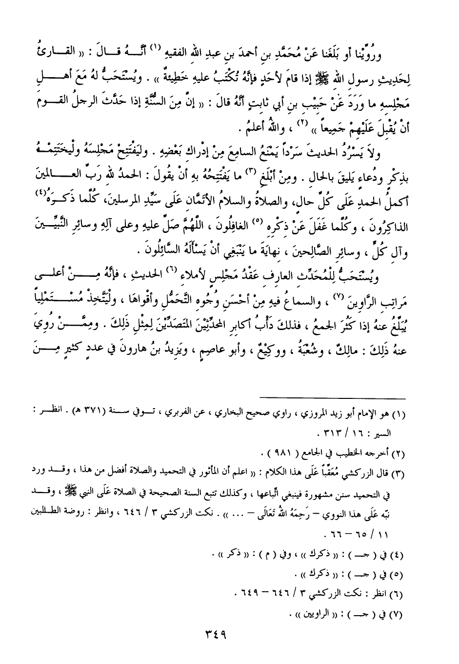 (¬3) قال الزركشي مُعَقِّباً عَلَى هذا الكلام: ((اعلم أن المأثور في التحميد والصلاة أفضل من هذا، وقد ورد في التحميد سنن مشهورة فينبغي اتِّباعها، وكذلك تتبع السنة الصحيحة في الصلاة عَلَى النبي - صلى الله عليه وسلم -، وقد نبّه عَلَى هذا النووي - رَحِمَهُ اللهُ تَعَالَى - ... )). نكت الزركشي 3/ 646، وانظر: روضة الطالبين 11/ 65 - 66.
