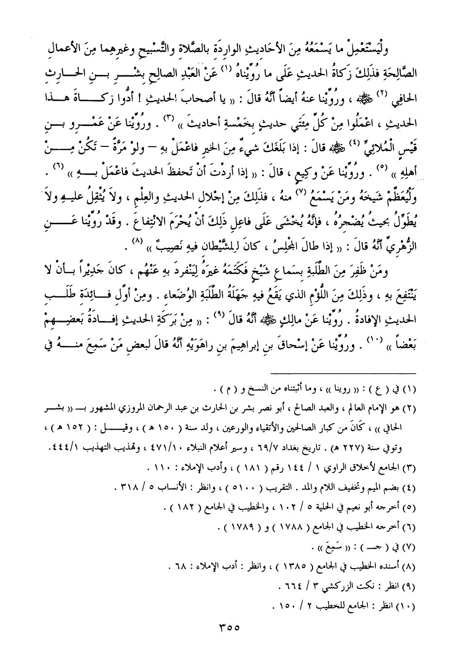 الحافِي (¬2) - رضي الله عنه -، ورُوِّيْنا عنهُ أيضاً أنَّهُ قالَ: ((يا أصحابَ الحديثِ! أدُّوا زكاةَ هذا الحديثِ، اعْمَلُوا مِنْ كُلِّ مِئَتَي حديثٍ بِخَمْسةِ أحاديثَ)) (¬3). ورُوِّيْنا عَنْ عَمْرِو بنِ قَيْسٍ الْمُلائِيِّ (¬4) - رضي الله عنه - قالَ: إذا بَلَغَكَ شيءٌ مِنَ الخيرِ فاعْمَلْ بهِ - ولوْ مَرَّةً - تَكُنْ مِنْ أهلِهِ)) (¬5). ورُوِّيْنا عَنْ وكِيعٍ، قالَ: ((إذا أردْتَ أنْ تَحفظَ الحديثَ فاعْمَلْ بهِ)) (¬6). وَلْيُعَظِّمْ شَيخَهُ ومَنْ يَسْمَعُ (¬7) منهُ، فذَلِكَ مِنْ إجْلالِ الحديثِ والعِلْمِ، ولاَ يُثْقِلُ عليهِ ولاَ يُطَوِّلُ بحيثُ يُضْجِرُهُ، فإنَّهُ يُخْشَى عَلَى فاعِلِ ذَلِكَ أنْ يُحْرَمَ الانْتِفاعَ. وقَدْ رُوِّيْنا عَنِ الزُّهْرِيِّ أنَّهُ قالَ: ((إذا طالَ المجْلِسُ، كانَ لِلشَّيْطانِ فيهِ نَصِيبٌ)) (¬8).