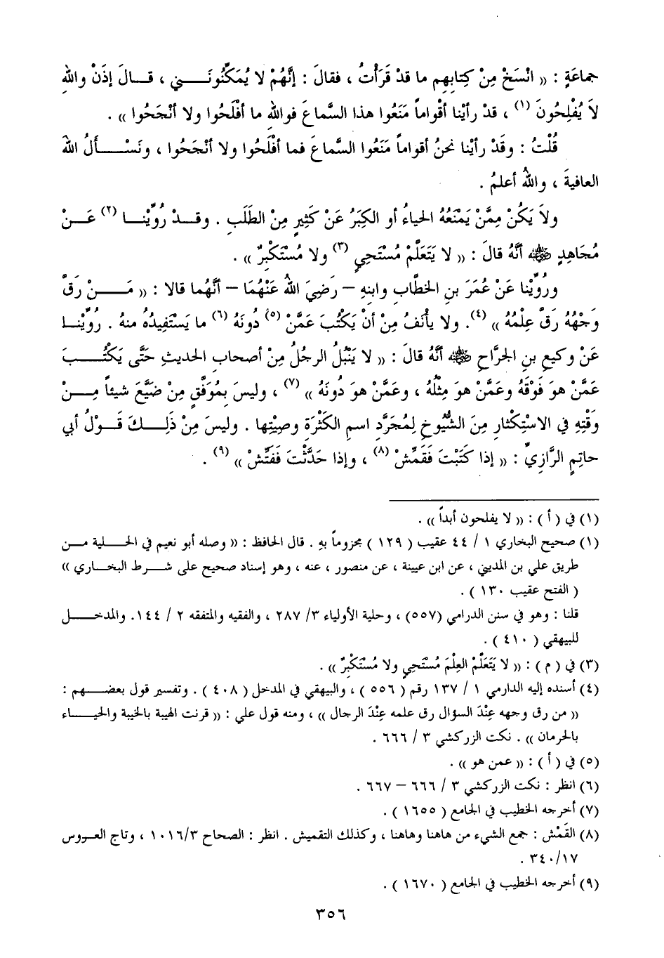 ورُوِّيْنا عَنْ عُمَرَ بنِ الخطَّابِ وابنِهِ - رَضِيَ اللهُ عَنْهُمَا - أنَّهُما قالا: ((مَنْ رَقَّ وَجْهُهُ رَقَّ عِلْمُهُ)) (¬4). ولا يأْنَفُ مِنْ أنْ يَكْتُبَ عَمَّنْ (¬5) دُونَهُ (¬6) ما يَسْتَفِيدُهُ منهُ. رُوِّيْنا عَنْ وكيعِ بنِ الجرَّاحِ - رضي الله عنه - أنَّهُ قالَ: ((لا يَنْبُلُ الرجُلُ مِنْ أصحابِ الحديثِ حَتَّى يَكْتُبَ عَمَّنْ هوَ فَوْقَهُ وعَمَّنْ هوَ مِثْلُهُ، وعَمَّنْ هوَ دُونَهُ)) (¬7)، وليسَ بِمُوَفَّقٍ مِنْ ضَيَّعَ شيئاً مِنْ وَقْتِهِ في الاسْتِكْثارِ مِنَ الشُّيُوخِ لِمُجَرَّدِ اسمِ الكَثْرَةِ وصِيْتِها. وليسَ مِنْ ذَلِكَ قَوْلُ أبي حاتِمٍ الرَّازِيِّ: ((إذا كَتَبْتَ فَقَمِّشْ (¬8)، وإذا حَدَّثْتَ فَفَتِّشْ)) (¬9).