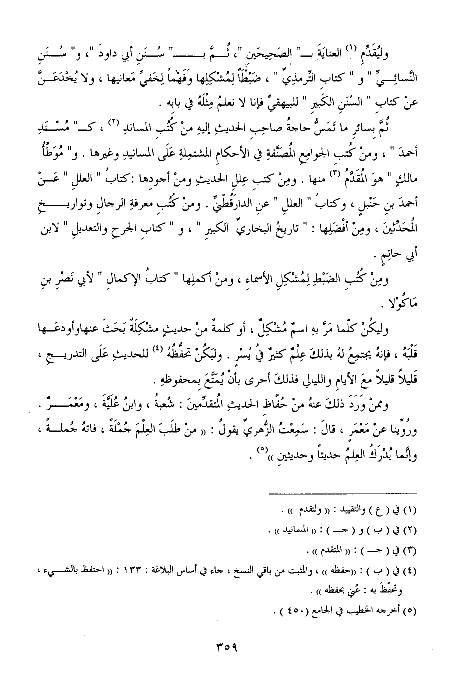 وليُقَدِّمِ (¬1) العنايَةَ بـ" الصَحِيحَينِ "، ثُمَّ بـ" سُنَنِ أبي داودَ "، و" سُنَنِ النَّسائِيِّ " و " كتابِ التِّرمذِيِّ "، ضَبْطَاً لِمُشْكِلِها وَفَهْماً لِخَفيِّ مَعانيها، ولا يُخْدَعَنَّ عنْ كتابِ " السُنَنِ الكَبيرِ " للبيهقيِّ فإنا لا نعلمُ مِثْلَهُ في بابِه.