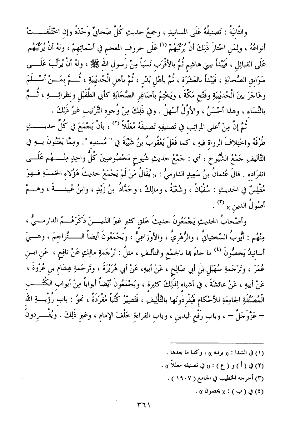 ثُمَّ إنَّ مِنْ أعلى المراتِبِ في تَصنيفِهِ تَصنيفَهُ مُعَلَّلاً (¬2)، بأنْ يَجْمَعَ في كُلِّ حديثٍ طُرُقَهُ واخْتِلافَ الرواةِ فيهِ، كما فَعَلَ يَعْقُوبُ بنُ شَيْبَةَ في " مُسندِهِ ". ومِمَّا يَعْتَنُونَ بهِ في التَّأليفِ جَمْعُ الشُّيُوخِ، أي: جَمْعُ حديثِ شُيوخٍ مَخْصُوصِينَ كُلُّ واحِدٍ مِنْهُم عَلَى انفرَادِهِ. قالَ عُثمانُ بنُ سَعِيدٍ الدارميُّ: ((يُقَالُ مَنْ لَمْ يَجْمَعْ حديثَ هَؤُلاءِ الخمسَةِ فهوَ مُفْلِسٌ في الحديثِ: سُفْيَانُ، وشُعْبَةُ، ومالِكٌ، وحَمَّادُ بنُ زَيْدٍ، وابنُ عُيينةَ، وهمْ أصُولُ الدينِ)) (¬3).