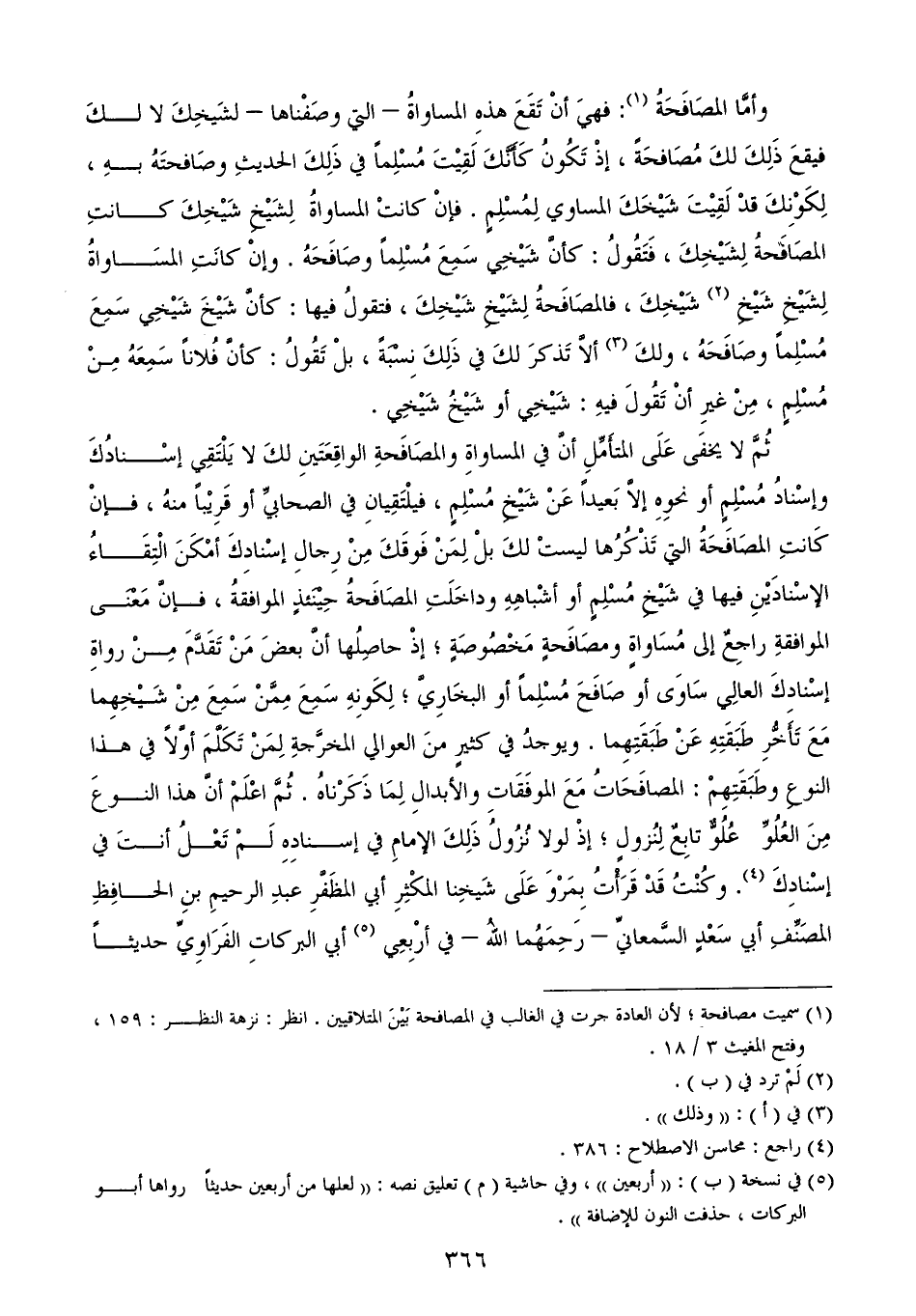 ثُمَّ لا يخفَى عَلَى المتأَمِّلِ أنَّ في المساواةِ والمصَافَحةِ الواقِعَتَينِ لكَ لا يَلْتَقِي إسْنادُكَ وإسْنادُ مُسْلِمٍ أو نحوِهِ إلاَّ بَعيداً عَنْ شَيْخِ مُسْلِمٍ، فيلْتَقِيانِ في الصحابيِّ أو قَرِيْباً منهُ، فإنْ كَانتِ المصَافَحَةُ التي تَذْكُرُها ليستْ لكَ بلْ لِمَنْ فَوقَكَ مِنْ رِجالِ إسْنادِكَ أمْكَنَ الْتِقَاءُ الإسْنادَيْنِ فيها في شَيْخِ مُسْلِمٍ أو أشْباهِهِ وداخَلَتِ المصَافَحةُ حِيْنَئذٍ الموافقةُ، فإنَّ مَعْنَى الموافقةِ راجِعٌ إلى مُسَاواةٍ ومصَافَحةٍ مَخْصُوصَةٍ؛ إذْ حاصِلُها أنَّ بعضَ مَنْ تَقَدَّمَ مِنْ رواةِ إسْنادِكَ العالِي سَاوَى أو صَافَحَ مُسْلِماً أو البخَارِيَّ؛ لِكَونِهِ سَمِعَ مِمَّنْ سَمِعَ مِنْ شَيْخِهِما مَعَ تَأَخُّرِ طَبَقَتِهِ عَنْ طَبَقَتِهِما. ويوجدُ في كثيرٍ منَ العوالي المخرَّجةِ لِمَنْ تَكَلَّمَ أوَّلاً في هذا النوعِ وطَبَقَتِهِمْ: المصافَحَاتُ مَعَ الموفَقَاتِ والأبدالِ لِمَا ذَكَرْناهُ. ثُمَّ اعْلَمْ أنَّ هذا النوعَ مِنَ العُلُوِّ عُلُوٌّ تابِعٌ لِنُزولٍ؛ إذْ لولا نُزُولُ ذَلِكَ الإمامِ في إسنادِهِ لَمْ تَعْلُ أنتَ في