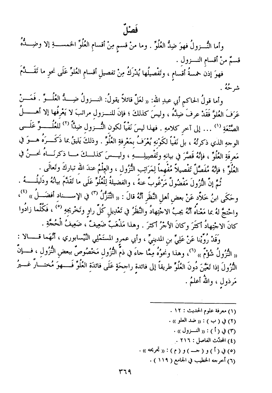 وَقَدْ رُوِّيْنا عَنْ عَلِيِّ بنِ المدينِيِّ، وأبي عمرٍو المستَمْلِي النَّيْسابوري، أنَّهَما قالا: ((النُّزُولُ شُؤْمٌ)) (¬6)، وهذا ونحوُهُ مِمَّا جاءَ في ذمِّ النُّزُولِ مَخْصُوصٌ ببعضِ النُّزُولِ، فإنَّ النُّزُولَ إذا تَعَيَّنَ دُونَ العُلُوِّ طريقاً إلى فائدةٍ راجِحَةٍ عَلَى فائدَةِ العُلُوِّ فَهوَ مُختارٌ غيرُ مَرذولٍ، واللهُ أعلمُ.