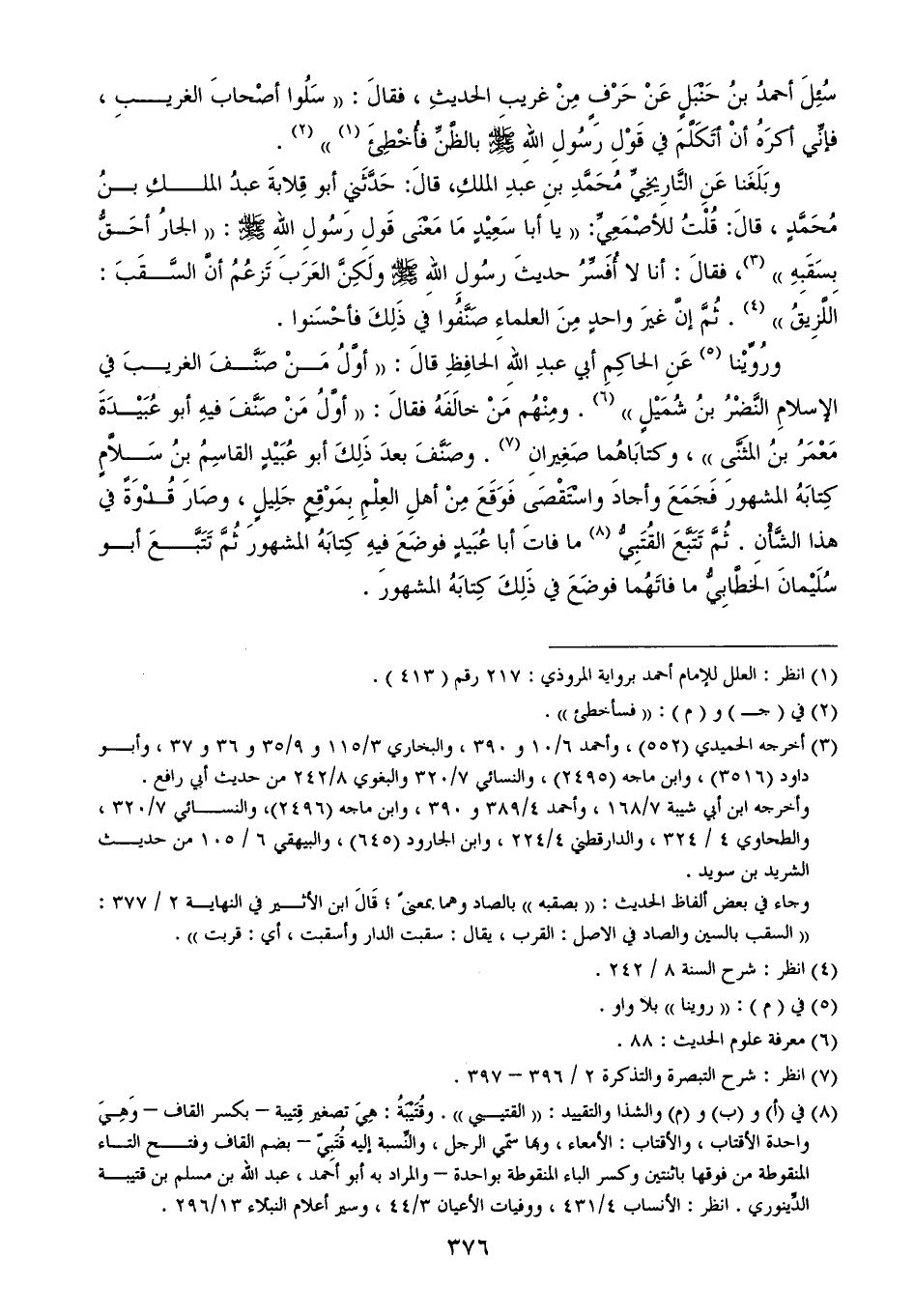 سُئِلَ أحمدُ بنُ حَنْبَلٍ عَنْ حَرْفٍ مِنْ غريبِ الحديثِ، فقالَ: ((سَلُوا أصْحابَ الغريبِ، فإنِّي أكرَهُ أنْ أتَكَلَّمَ في قَوْلِ رَسُولِ اللهِ - صلى الله عليه وسلم - بالظَّنِّ فأُخْطِئَ (¬1))) (¬2).