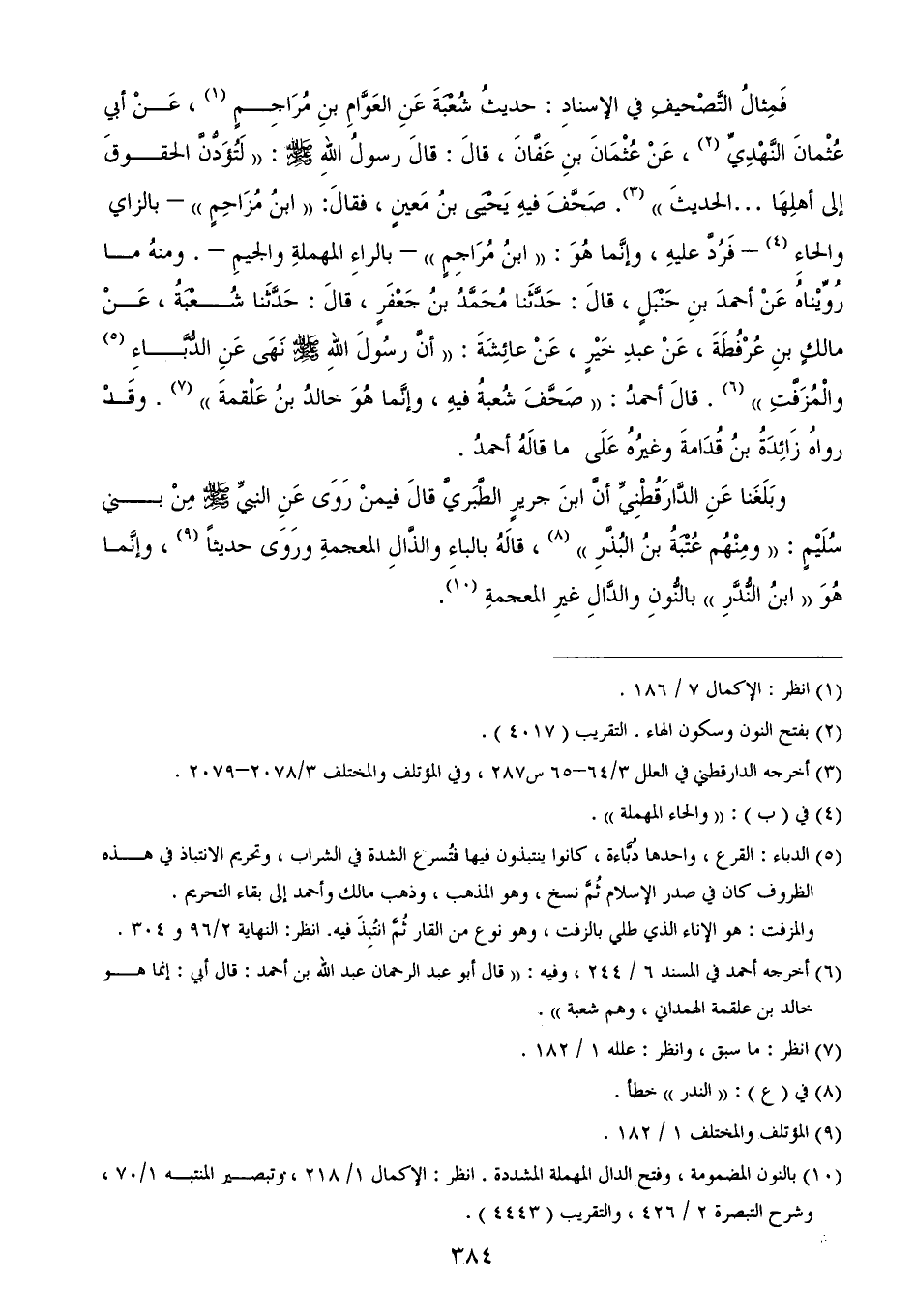 فَمِثالُ التَّصْحيفِ في الإسنادِ: حديثُ شُعْبَةَ عَنِ العَوَّامِ بنِ مُرَاجِمٍ (¬1)، عَنْ أبي عُثْمانَ النَّهْدِيِّ (¬2)، عَنْ عُثْمَانَ بنِ عَفَّانَ، قالَ: قالَ رسولُ اللهِ - صلى الله عليه وسلم -: ((لَتُؤَدُّنَّ الحقوقَ إلى أهلِهَا ... الحديثَ)) (¬3). صَحَّفَ فيهِ يَحْيَى بنُ مَعينٍ، فقالَ: ((ابنُ مُزَاحِمٍ)) - بالزاي والحاءِ (¬4) - فَرُدَّ عليهِ، وإنَّما هُوَ: ((ابنُ مُرَاجِمٍ)) - بالراءِ المهملةِ والجيمِ -. ومنهُ ما رُوِّيْناهُ عَنْ أحمدَ بنِ حَنْبَلٍ، قالَ: حَدَّثَنا مُحَمَّدُ بنُ جَعْفَرٍ، قالَ: حَدَّثَنا شُعْبَةُ، عَنْ مالكٍ بنِ عُرْفُطَةَ، عَنْ عبدِ خَيْرٍ، عَنْ عائِشَةَ: ((أنَّ رسُولَ اللهِ - صلى الله عليه وسلم - نَهَى عَنِ الدُّبَّاءِ (¬5) والْمُزَفَّتِ)) (¬6). قالَ أحمدُ: ((صَحَّفَ شُعبةُ فيهِ، وإنَّما هُوَ خالدُ بنُ عَلْقمةَ)) (¬7). وقَدْ رواهُ زَائِدَةُ بنُ قُدَامةَ وغيرُهُ عَلَى ما قالَهُ أحمدُ.