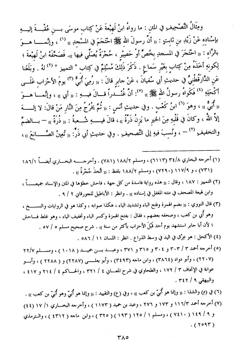ومِثَالُ التَّصْحِيفِ في المتنِ: ما رواهُ ابنُ لَهِيْعةَ عَنْ كِتابِ موسَى بنِ عُقْبةَ إليهِ بإسْنادِهِ عَنْ زَيْدِ بنِ ثابِتٍ: ((أنَّ رسولَ اللهِ - صلى الله عليه وسلم - احْتَجَمَ في المسْجِدِ)) (¬1)، وإنَّما هوَ بالرَّاءِ: ((احْتَجَرَ في المسجدِ بِخُصٍّ أوْ حَصِيْرٍ، حُجْرَةً يُصَلِّي فيها)). فَصَحَّفَهُ ابنُ لَهِيْعةَ؛ لِكونِهِ أخَذَهُ مِنْ كِتابٍ بِغَيْرِ سَماعٍ. ذَكَرَ ذَلِكَ مُسْلِمٌ في كِتابِ " التمييز " (¬2) لهُ. وبَلَغَنا عَنِ الدَّارَقُطْنِيِّ في حديثِ أبي سُفيانَ، عَنْ جابِرٍ قالَ: ((رُمِيَ أُبَيٌّ (¬3) يومَ الأحْزابِ عَلَى أكْحَلِهِ (¬4) فَكَواهُ رسولُ اللهِ - صلى الله عليه وسلم -)) (¬5): أنَّ غُنْدراً قالَ فيهِ: ((أبي))، وإنَّما هوَ ((أُبَيٌّ))، وهوَ (¬6) ابنُ كَعْبٍ. وفي حديثِ أنَسٍ: ((ثُمَّ يخْرُجُ مِنَ النَّارِ مَنْ قالَ: لا إلهَ إلاَّ اللهُ، وكانَ في قَلْبِهِ مِنَ الخيرِ ما يَزِنُ ذَرَّةً))، قالَ فيهِ شُعبةُ: ((ذُرَةً)) - بالضمِّ والتخفيفِ (¬7) -، ونُسِبَ فيهِ إلى التَّصحيفِ. وفي حديثِ أبي ذَرٍّ: ((تُعِينُ الصَّانِعَ))،