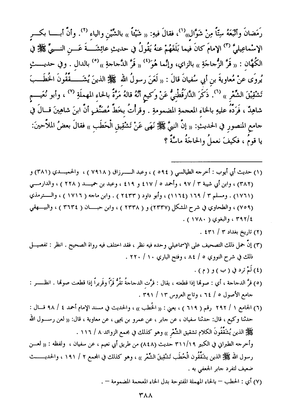 (¬6) الجامع 1/ 292 رقم (619)، يعني: ((الخُطب))، والحديث في مسند الإمام أحمد 4/ 98 قال: حدثنا وكيع، قال: حدثنا سفيان، عن جابر، عن عمرو بن يحيى، عن معاوية، قال: ((لعن رسول الله - صلى الله عليه وسلم - الذين يُشَقِّقُونَ الكلام تشقيق الشِّعْرِ)) وهو كذلك في مجمع الزوائد 8/ 116.