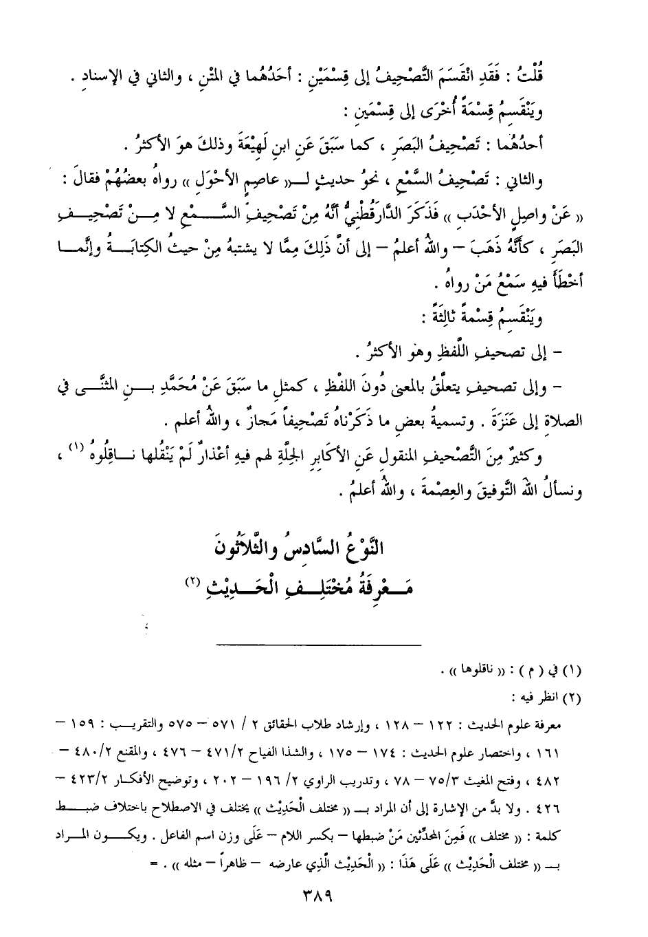 قُلْتُ: فَقَدِ انْقَسَمَ التَّصْحِيفُ إلى قِسْمَيْنِ: أحَدُهُما في المتْنِ، والثاني في الإسنادِ.