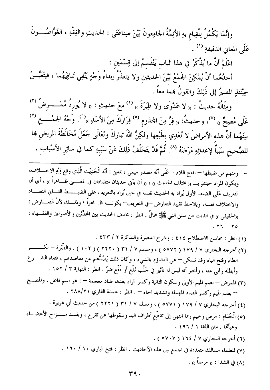 ومِثَالُهُ حديثُ: ((لا عَدْوَى ولا طِيَرَةَ)) (¬2) معَ حديثِ: ((لا يُورِدُ مُمْرِضٌ (¬3) عَلَى مُصِحٍّ)) (¬4)، وحديثُ: ((فِرَّ مِنَ المجذومِ (¬5) فِرَارَكَ مِنَ الأسَدِ)) (¬6). وَجْهُ الجمْعِ (¬7) بينَهُما أنَّ هذهِ الأمراضَ لا تُعْدِي بِطَبْعِها ولكِنَّ اللهَ تباركَ وتَعَالَى جَعَلَ مُخَالَطَةَ المريضِ بها للصَّحيحِ سَبَباً لإعدائِهِ مَرَضَهُ (¬8). ثُمَّ قَدْ يتَخَلَّفُ ذَلِكَ عَنْ سَبَبِهِ كما في سائِرِ الأسْبابِ.