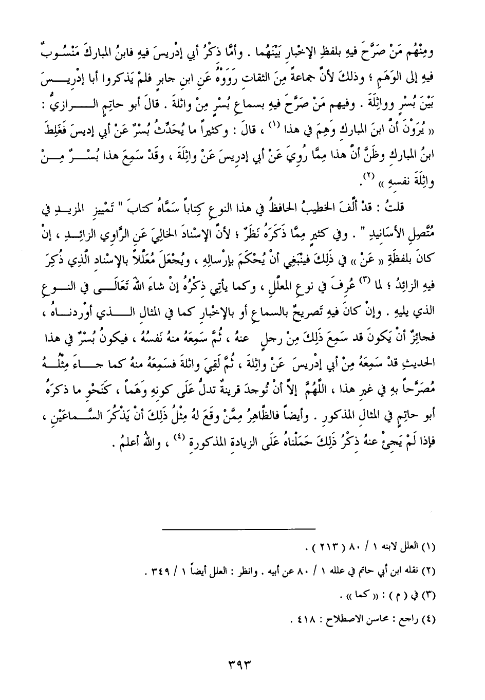 قلتُ: قدْ ألَّفَ الخطيبُ الحافظُ في هذا النوعِ كِتاباً سَمَّاهُ كتابَ " تَمْييزِ المزيدِ في مُتَّصِلِ الأسَانِيدِ ". وفي كثيرٍ مِمَّا ذَكَرَهُ نَظَرٌ؛ لأنَّ الإسْنادَ الخالِيَ عَنِ الرَّاوِي الزائِدِ، إنْ كانَ بلفظَةِ ((عَنْ)) في ذَلِكَ فينْبَغِي أنْ يُحْكَمَ بإرْسالِهِ، ويُجْعَلَ مُعَلَّلاً بالإسْنادِ الَّذِي ذُكِرَ فيهِ الزائِدُ؛ لما (¬3) عُرِفَ في نوعِ المعلَّلِ، وكما يأتِي ذِكْرُهُ إنْ شاءَ اللهَ تَعَالَى في النوعِ الذي يليهِ. وإنْ كانَ فيهِ تَصريحٌ بالسماعِ أو بالإخْبارِ كما في المثالِ الذي أوْردناهُ، فجائِزٌ أنْ يَكونَ قد سَمِعَ ذَلِكَ مِنْ رجلٍ عنهُ، ثُمَّ سَمِعَهُ منهُ نَفسُهُ، فيكونُ بُسْرٌ في هذا الحديثِ قدْ سَمِعَهُ مِنْ أبي إدْريسَ عَنْ واثِلةَ، ثُمَّ لَقِيَ واثلةَ فسَمِعَهُ منهُ كما جاءَ مِثْلُهُ مُصَرَّحاً بهِ في غيرِ هذا، اللَّهُمَّ إلاَّ أنْ تُوجدَ قرينةٌ تدلُّ عَلَى كونِهِ وَهَماً، كَنَحْوِ ما ذكرَهُ أبو حاتِمٍ في المثالِ المذكورِ. وأيضاً فالظَّاهِرُ مِمَّنْ وقَعَ لهُ مِثْلُ ذَلِكَ أنْ يَذْكُرَ السَّماعَيْنِ، فإذا لَمْ يَجِئْ عنهُ ذِكْرُ ذَلِكَ حَمَلْناهُ عَلَى الزيادةِ المذكورةِ (¬4)، واللهُ أعلمُ.