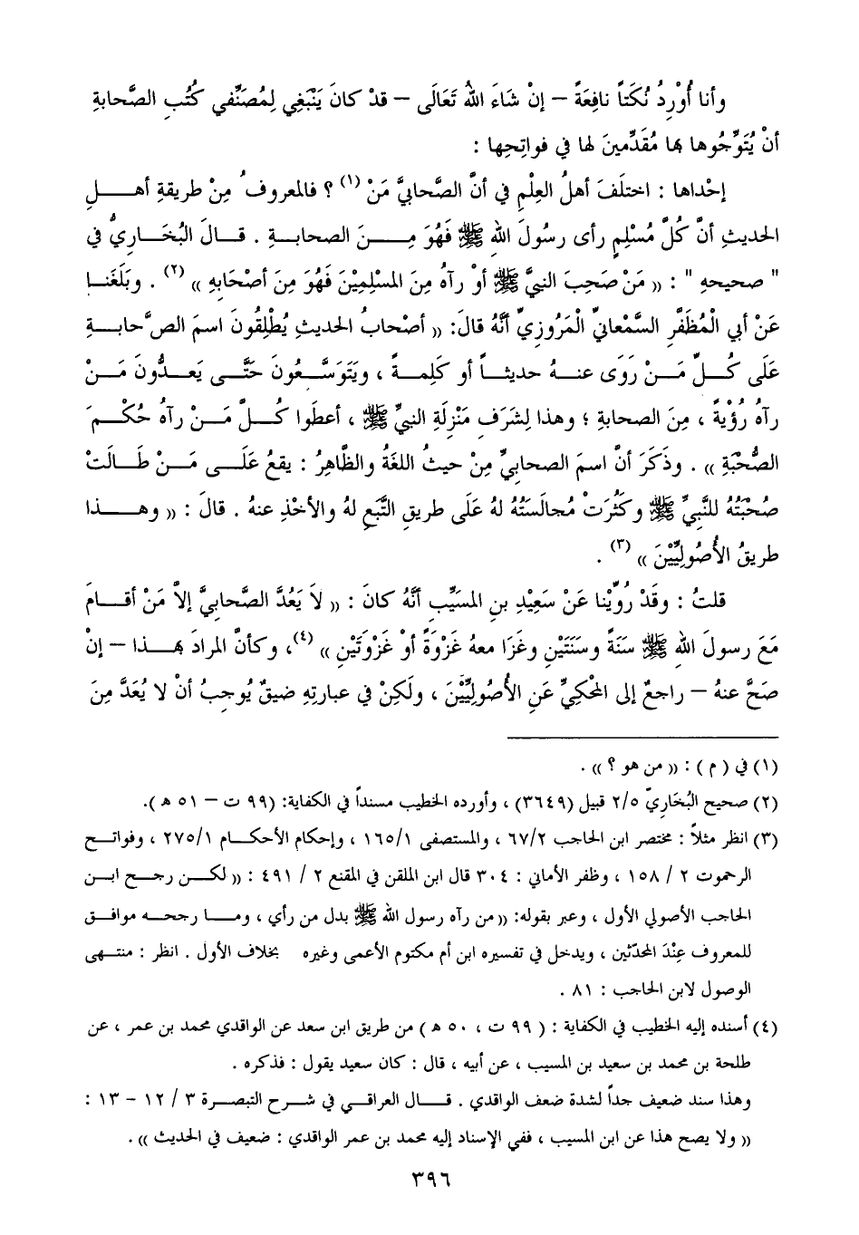 (¬3) انظر مثلاً: مختصر ابن الحاجب 2/ 67، والمستصفى 1/ 165، وإحكام الأحكام 1/ 275، وفواتح الرحموت 2/ 158، وظفر الأماني: 304 قال ابن الملقن في المقنع 2/ 491: ((لكن رجح ابن الحاجب الأصولي الأول، وعبر بقوله: ((من رآه رسول الله - صلى الله عليه وسلم - بدل من رأي، وما رجحه موافق للمعروف عِنْدَ المحدّثين، ويدخل في تفسيره ابن أم مكتوم الأعمى وغيره ... بخلاف الأول. انظر: منتهى الوصول لابن الحاجب: 81.