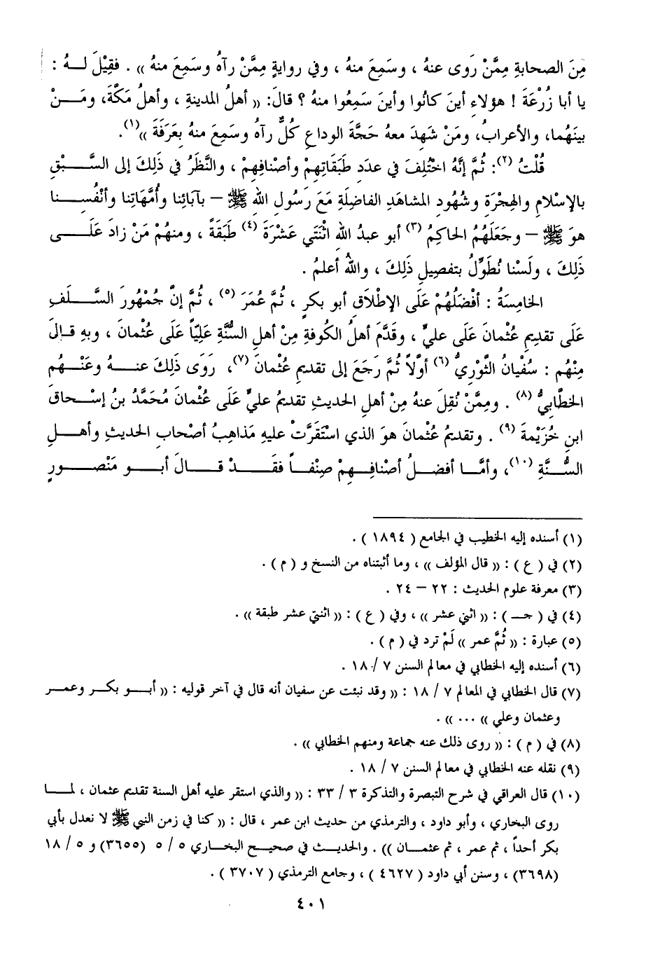 الخامِسَةُ: أفْضَلُهُمْ عَلَى الإطْلاَقِ أبو بكرٍ، ثُمَّ عُمَرَ (¬5)، ثُمَّ إنَّ جُمْهُورَ السَّلَفِ عَلَى تقدِيمِ عُثْمانَ عَلَى عليٍّ، وقَدَّمَ أهلُ الكُوفةِ مِنْ أهلِ السُّنَّةِ عَلِيّاً عَلَى عُثْمانَ، وبهِ قالَ مِنْهُم: سُفْيانُ الثَّوْرِيُّ (¬6) أوَّلاً ثُمَّ رَجَعَ إلى تقديمِ عُثْمانَ (¬7)، رَوَى ذَلِكَ عنهُ وعَنْهُم الخطَّابِيُّ (¬8). ومِمَّنْ نُقِلَ عنهُ مِنْ أهلِ الحديثِ تقديمُ عليٍّ عَلَى عُثْمانَ مُحَمَّدُ بنُ إسْحاقَ ابنِ خُزَيْمةَ (¬9). وتقديمُ عُثْمانَ هوَ الذي اسْتَقَرَّتْ عليهِ مَذاهِبُ أصْحابِ الحديثِ وأهلِ السُّنَّةِ (¬10)، وأمَّا أفضلُ أصْنافِهِمْ صِنْفاً فقَدْ قالَ أبو مَنْصورٍ