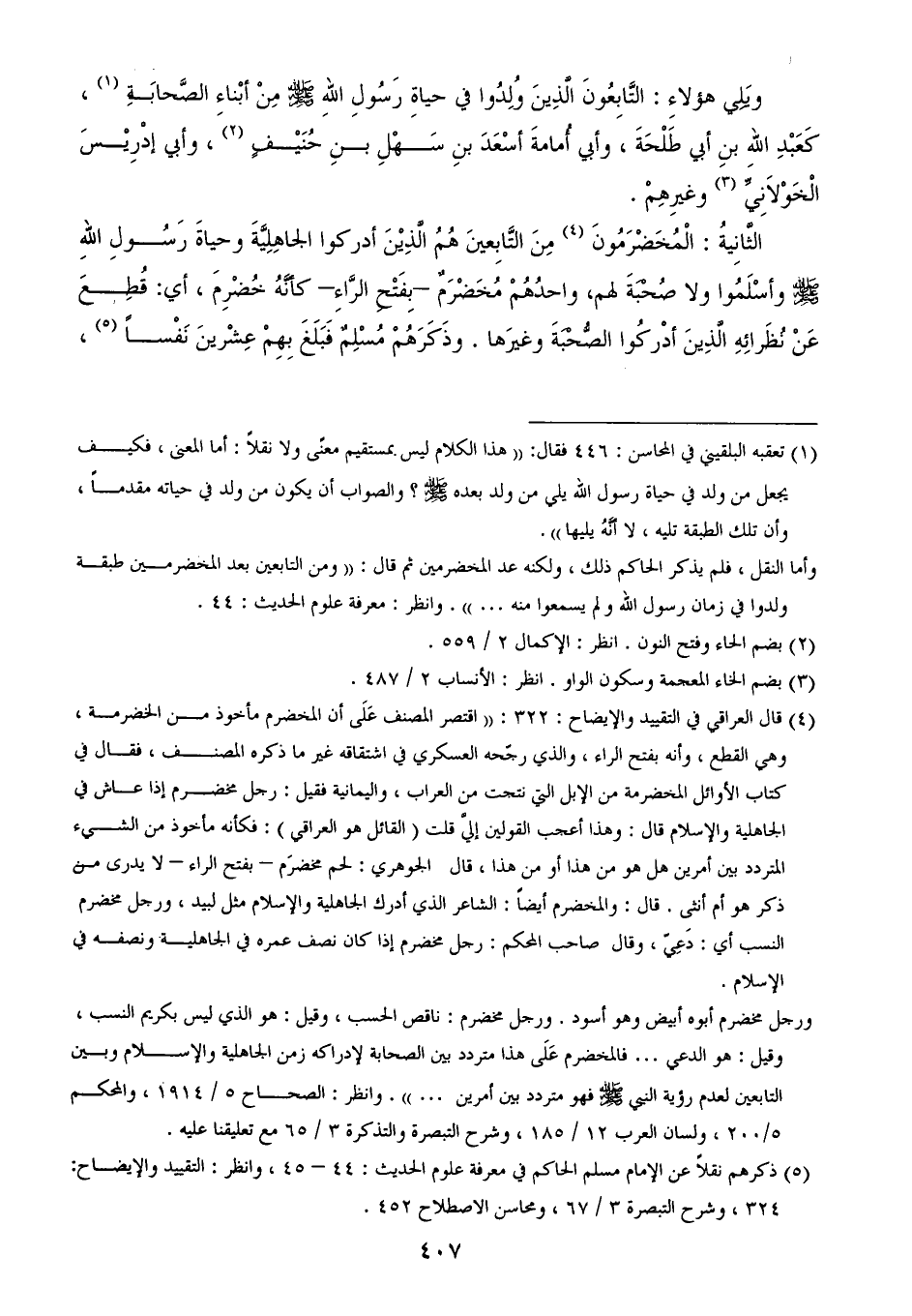 (¬1) تعقبه البلقيني في المحاسن: 446 فقال: ((هذا الكلام ليس بمستقيم معنًى ولا نقلاً: أما المعنى، فكيف يجعل من ولد في حياة رسول الله يلي من ولد بعده - صلى الله عليه وسلم -؟ والصواب أن يكون من ولد في حياته مقدماً، وأن تلك الطبقة تليه، لا أنَّهُ يليها)).