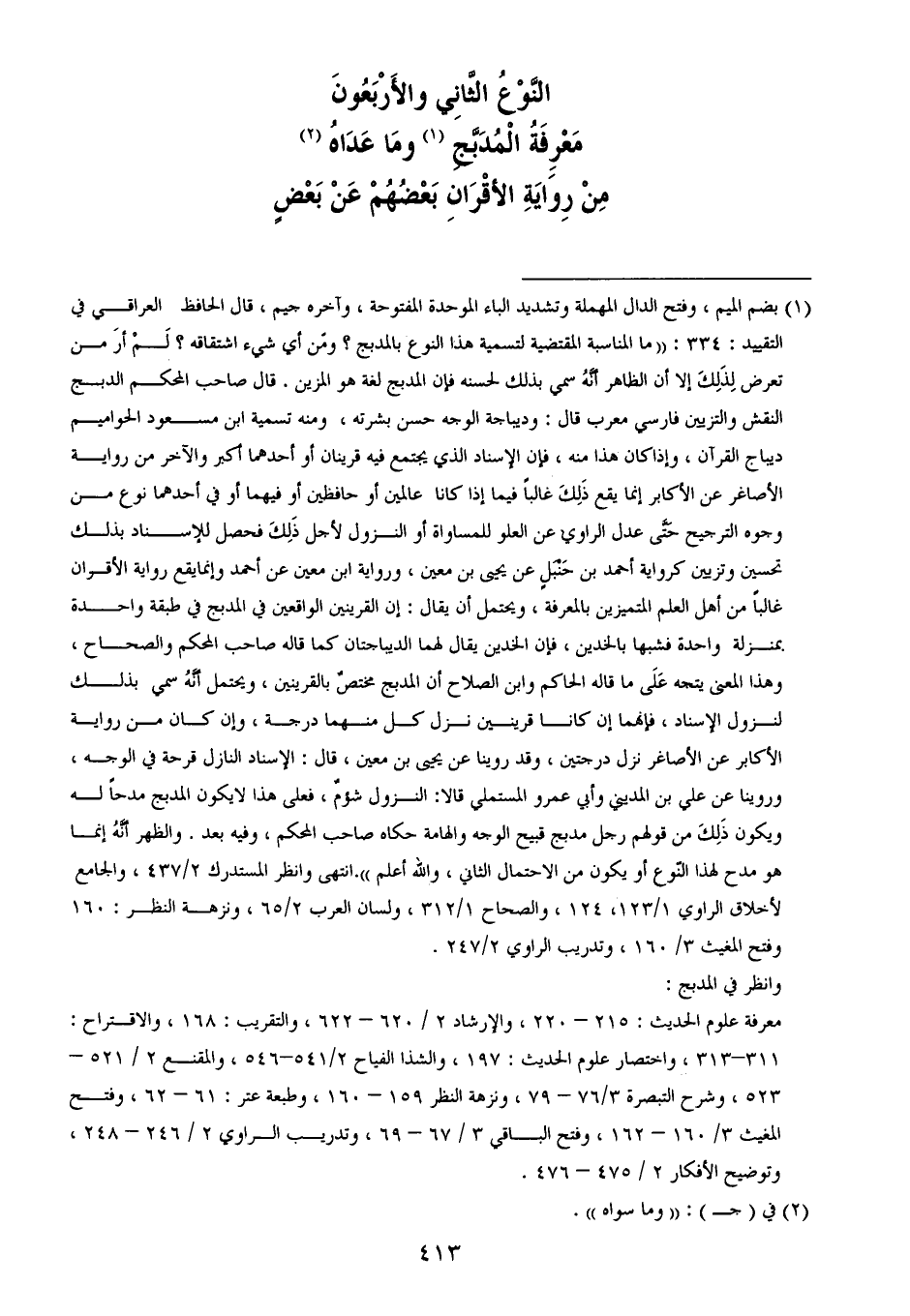 الأكابر عن الأصاغر نزل درجتين، وقد روينا عن يحيى بن معين، قال: الإسناد النازل قرحة في الوجه، وروينا عن علي بن المديني وأبي عمرو المستملي قالا: النزول شؤمٌ، فعلى هذا لايكون المدبج مدحاً له ويكون ذَلِكَ من قولهم رجل مدبج قبيح الوجه والهامة حكاه صاحب المحكم، وفيه بعد. والظهر أنَّهُ إنما هو مدح لهذا النّوع أو يكون من الاحتمال الثاني، والله أعلم)). انتهى وانظر المستدرك 2/ 437، والجامع لأخلاق الراوي 1/ 123، 124، والصحاح 1/ 312، ولسان العرب 2/ 65، ونزهة النظر: 160 وفتح المغيث 3/ 160، وتدريب الراوي 2/ 247.