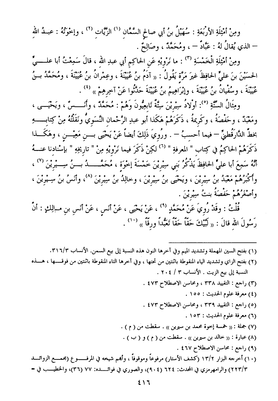 (¬10) أخرجه البزار 2/ 13 (كشف الأستار) مرفوعاً وموقوفاً، وأبهم شيخه في المرفوع (مجمع الزوائد 3/ 223) والرامهرمزي في المحدث: 624 (904)، والصوري في فوائده: 77 (36)، والخطيب في = =تاريخه 14/ 215 (سقط منه ذكر أنس بن سيرين، وكلام الخطيب بعده يقتضي ذكره)، و 14/ 216 وابن النجار في ذيل تاريخ بغداد 17/ 82، من طرق عن الحكم بن سنان والنضر بن شميل -منفردين- كلاهما عن محمد بن سيرين، عن أخيه يحيى بن سيرين، عن أخيه أنس بن سيرين، عن أنس بن مالك به مرفوعاً.