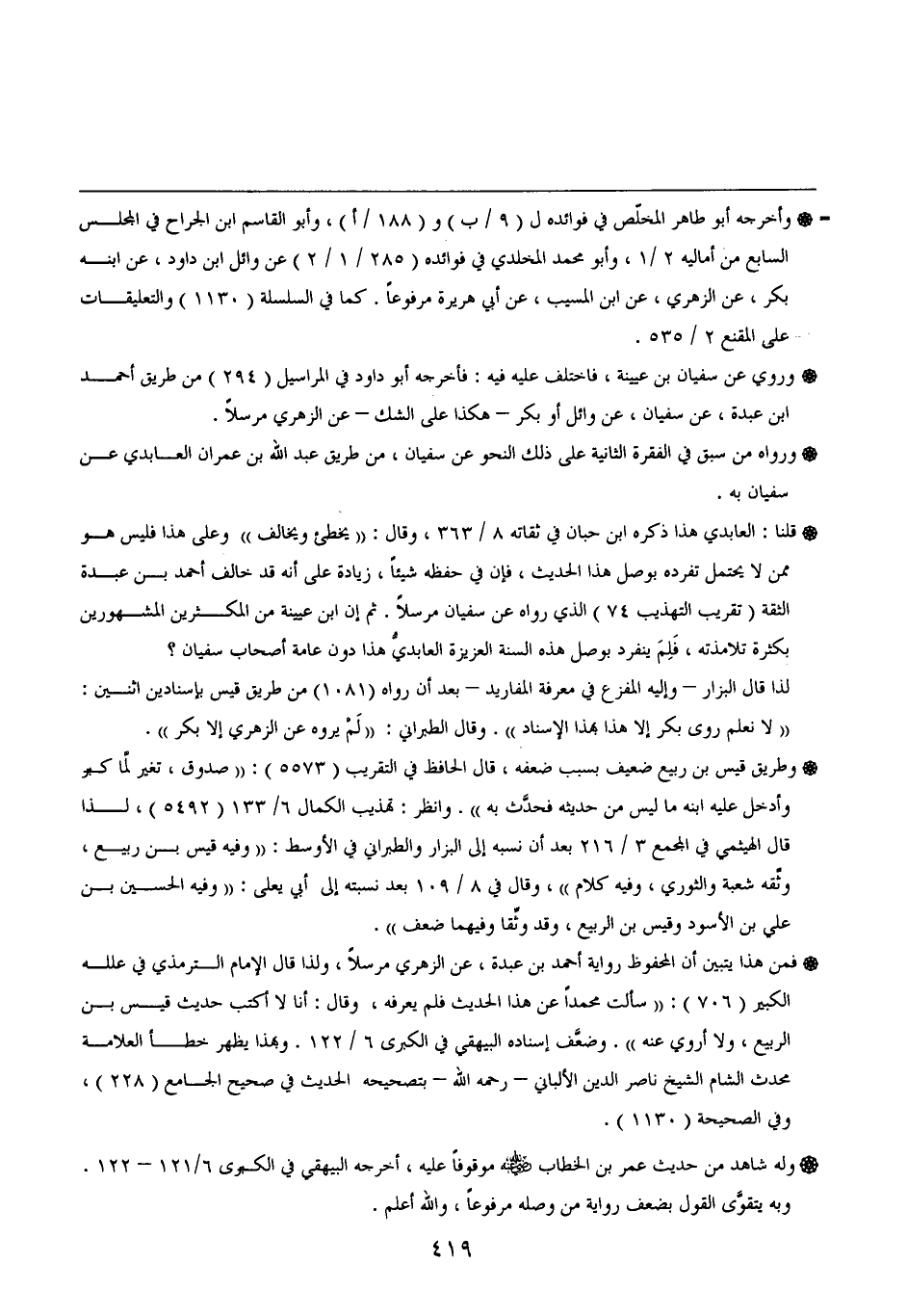 - فمن هذا يتبين أن المحفوظ رواية أحمد بن عبدة، عن الزهري مرسلاً، ولذا قال الإمام الترمذي في علله الكبير (706): ((سألت محمداً عن هذا الحديث فلم يعرفه، وقال: أنا لا أكتب حديث قيس بن الربيع، ولا أروي عنه)). وضعَّف إسناده البيهقي في الكبرى 6/ 122. وبهذا يظهر خطأ العلامة محدث الشام الشيخ ناصر الدين الألباني - رحمه الله - بتصحيحه الحديث في صحيح الجامع (228)، وفي الصحيحة (1130).