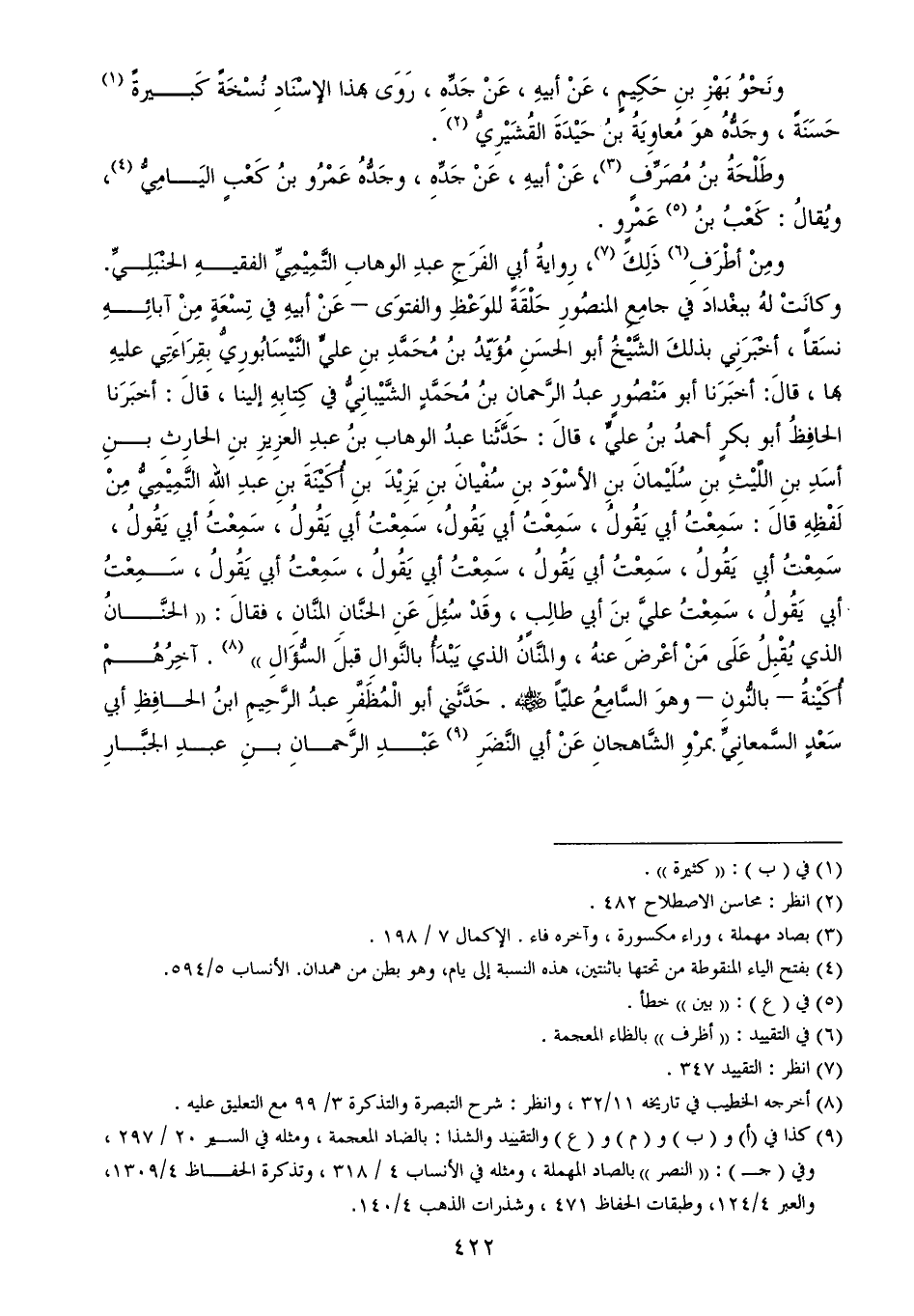 ومِنْ أطْرَفِ (¬6) ذَلِكَ (¬7)، رِوايةُ أبي الفَرَجِ عبدِ الوهابِ التَّمِيْمِيِّ الفقيهِ الحنْبَلِيِّ. وكانَتْ لهُ ببغْدادَ في جامِعِ المنصُورِ حَلْقَةً للوَعْظِ والفتوَى - عَنْ أبيهِ في تِسْعَةٍ مِنْ آبائِهِ نسَقاً، أخْبَرَنِي بذلكَ الشَّيْخُ أبو الحسَنِ مُؤَيّدُ بنُ مُحَمَّدِ بنِ عليٍّ النَّيْسَابُورِيُّ بِقِرَاءَتِي عليهِ بها، قالَ: أخبَرَنا أبو مَنْصُورٍ عبدُ الرَّحمانِ بنُ مُحَمَّدٍ الشَّيْبانِيُّ في كِتابِهِ إلينا، قالَ: أخبَرَنا الحافِظُ أبو بكرٍ أحمدُ بنُ عليٍّ، قالَ: حَدَّثَنا عبدُ الوهابِ بنُ عبدِ العزِيزِ بنِ الحارِثِ بنِ أسَدِ بنِ اللَّيْثِ بنِ سُلَيْمانَ بنِ الأسْوَدِ بنِ سُفْيانَ بنِ يَزِيْدَ بنِ أُكَيْنَةَ بنِ عبدِ اللهِ التَّمِيْمِيُّ مِنْ لَفْظِهِ قالَ: سَمِعْتُ أبي يَقُولُ، سَمِعْتُ أبي يَقُولُ، سَمِعْتُ أبي يَقُولُ، سَمِعْتُ أبي يَقُولُ، سَمِعْتُ أبي يَقُولُ، سَمِعْتُ أبي يَقُولُ، سَمِعْتُ أبي يَقُولُ، سَمِعْتُ أبي يَقُولُ، سَمِعْتُ أبي يَقُولُ، سَمِعْتُ عليَّ بنَ أبي طالِبٍ، وقَدْ سُئِلَ عَنِ الحنَّانِ المنَّانِ، فقالَ: ((الحنَّانُ الذي يُقْبِلُ عَلَى مَنْ أعْرضَ عنهُ، والمنَّانُ الذي يَبْدَأُ بالنَّوالِ قبلَ السُّؤَالِ)) (¬8). آخِرُهُمْ أُكَيْنةُ - بالنُّونِ - وهوَ السَّامِعُ عليّاً - رضي الله عنه -. حَدَّثَني أبو الْمُظَفَّرِ عبدُ الرَّحِيمِ ابنُ الحافِظِ أبي سَعْدٍ السَّمعانِيِّ بمرْوِ الشَّاهجانِ عَنْ أبي النَّضَرِ (¬9) عَبْدِ الرَّحمانِ بنِ عبدِ الجبَّارِ
