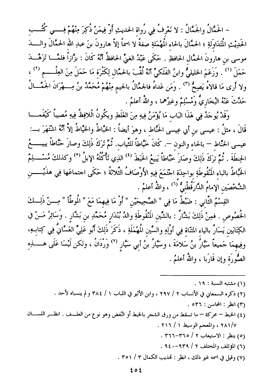 وَقَدْ يُوجَدُ فِي هَذَا البَابِ مَا يُؤْمَنُ فِيهِ مِنَ الغَلَطِ ويكُونُ الّلافِظُ فِيهِ مُصيباً كَيْفَما قَالَ، مثلُ: عيسى بنِ أبي عِيسى الحَنَّاطِ، وهوَ أيضاً: الخبَّاطُ والخيَّاطُ إلاَّ أنَّهُ اشْتَهَرَ بـ: عيسى الحنَّاطِ - بالحاءِ والنونِ -، كَانَ خَيَّاطاً للثِّيابِ. ثُمَّ تَرَكَ ذَلِكَ وصارَ حَنَّاطاً يبيعُ الحِنطَةَ. ثُمَّ ترَكَ ذَلِكَ وصَارَ خَبَّاطاً يَبيعُ الخَبَطَ (¬4) الذِي تَأْكُلُهُ الإبلُ (¬5) وكذلكَ مُسْلِمٌ الخَبَّاطُ - بالباءِ المَنْقُوطَةِ بِواحِدَةٍ - اجْتَمَعَ فِيهِ الأَوْصَافُ الثَّلاثةُ؛ حَكَى اجتماعَها فِي هذَيْنِ الشَّخْصَينِ الإمامُ الدَّارَقُطْنِيُّ (¬6)، واللهُ أعلمُ.