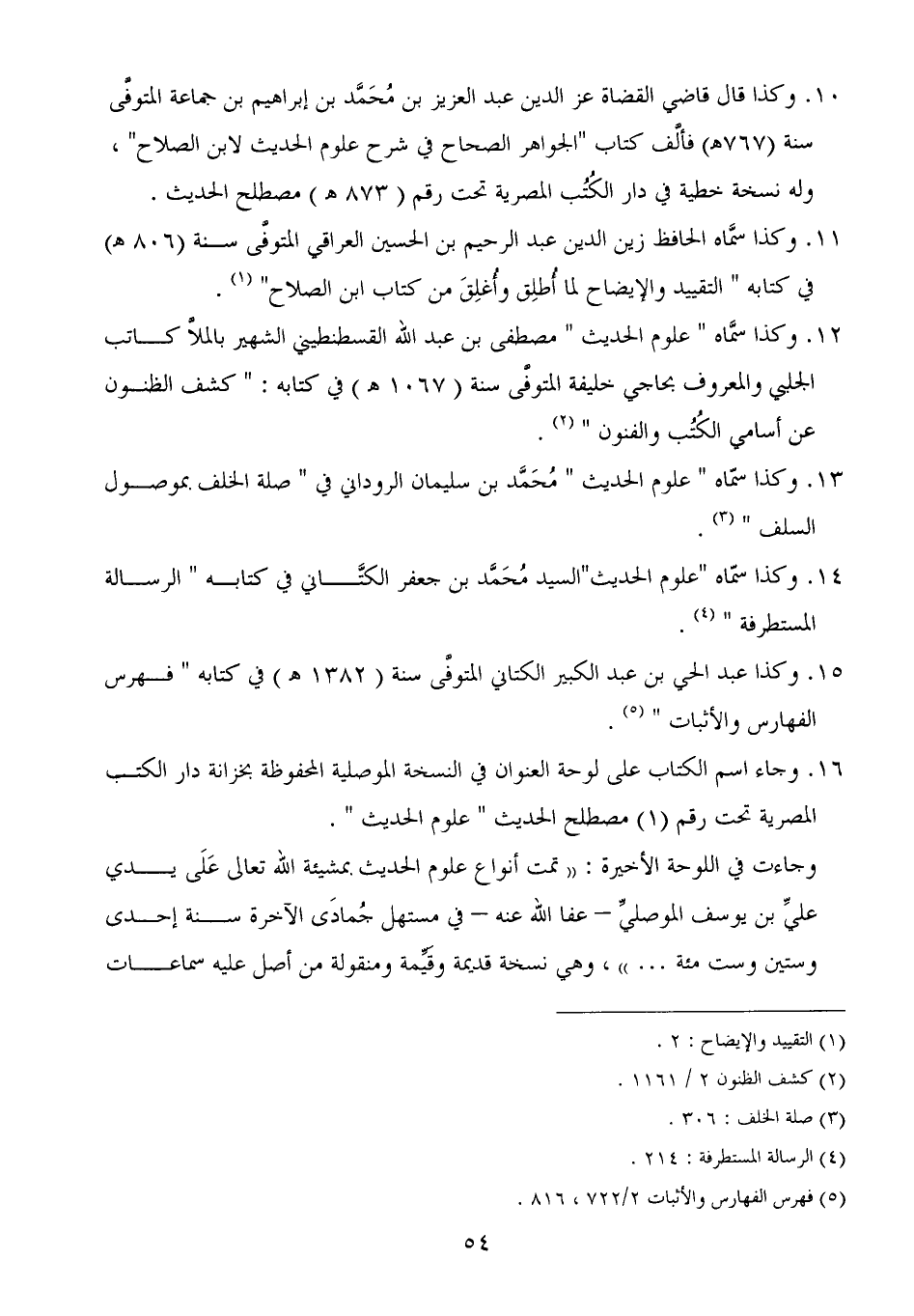 16. وجاء اسم الكتاب على لوحة العنوان في النسخة الموصلية المحفوظة بخزانة دار الكتب المصرية تحت رقم (1) مصطلح الحديث " علوم الحديث ".