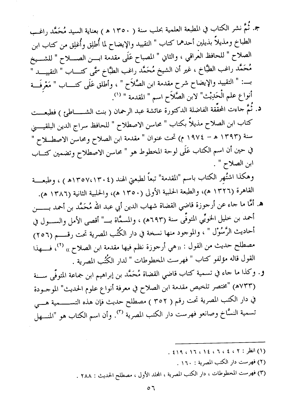 ج. ثُمَّ نشر الكتاب في المطبعة العلمية بحلب سنة (1350 هـ) بعناية السيد مُحَمَّد راغب الطباخ ومذيلاً بذيلين أحدهما كتاب " التقييد والإيضاح لما أُطلِق وأُغلِق من كتاب ابن الصلاح " للحافظ العراقي، والثاني " المصباح عَلَى مقدمة ابن الصلاح " للشيخ مُحَمَّد راغب الطبَّاخ، غير أن الشيخ مُحَمَّد راغب الطبَّاخ سمَّى كتاب " التقييد " بـ: " التقييد والإيضاح شرح مقدمة ابن الصَّلاَح "، وأطلق عَلَى كتاب " مَعْرِفَة أنواع علم الْحَدِيْث" لابن الصَّلاَح اسم " المقدمة " (¬1).
