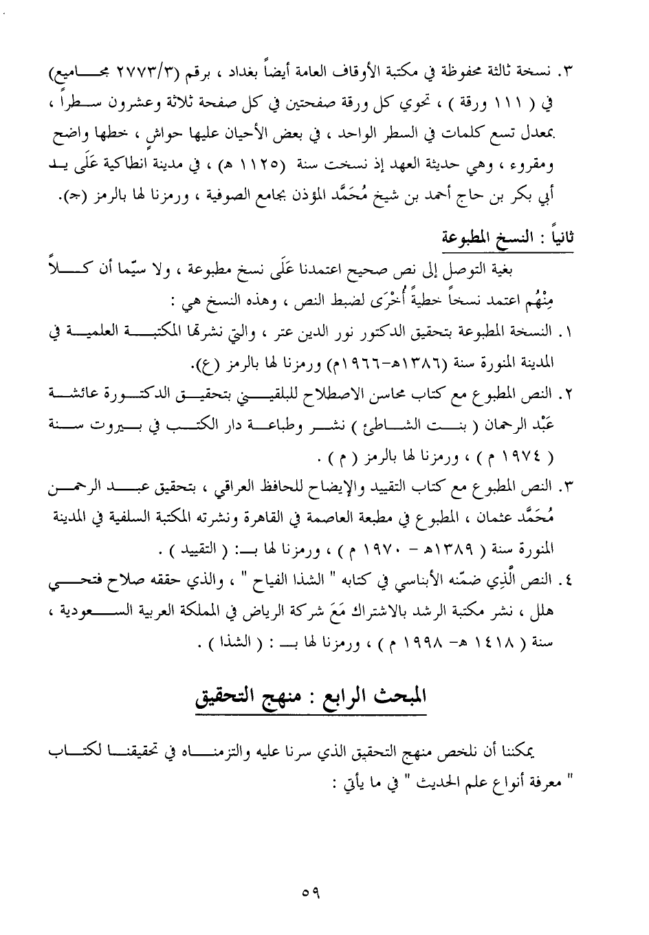 4. النص الَّذِي ضمّنه الأبناسي في كتابه " الشذا الفياح "، والذي حققه صلاح فتحي هلل، نشر مكتبة الرشد بالاشتراك مَعَ شركة الرياض في المملكة العربية السعودية، سنة (1418 هـ1998 م)، ورمزنا لها بـ: (الشذا).