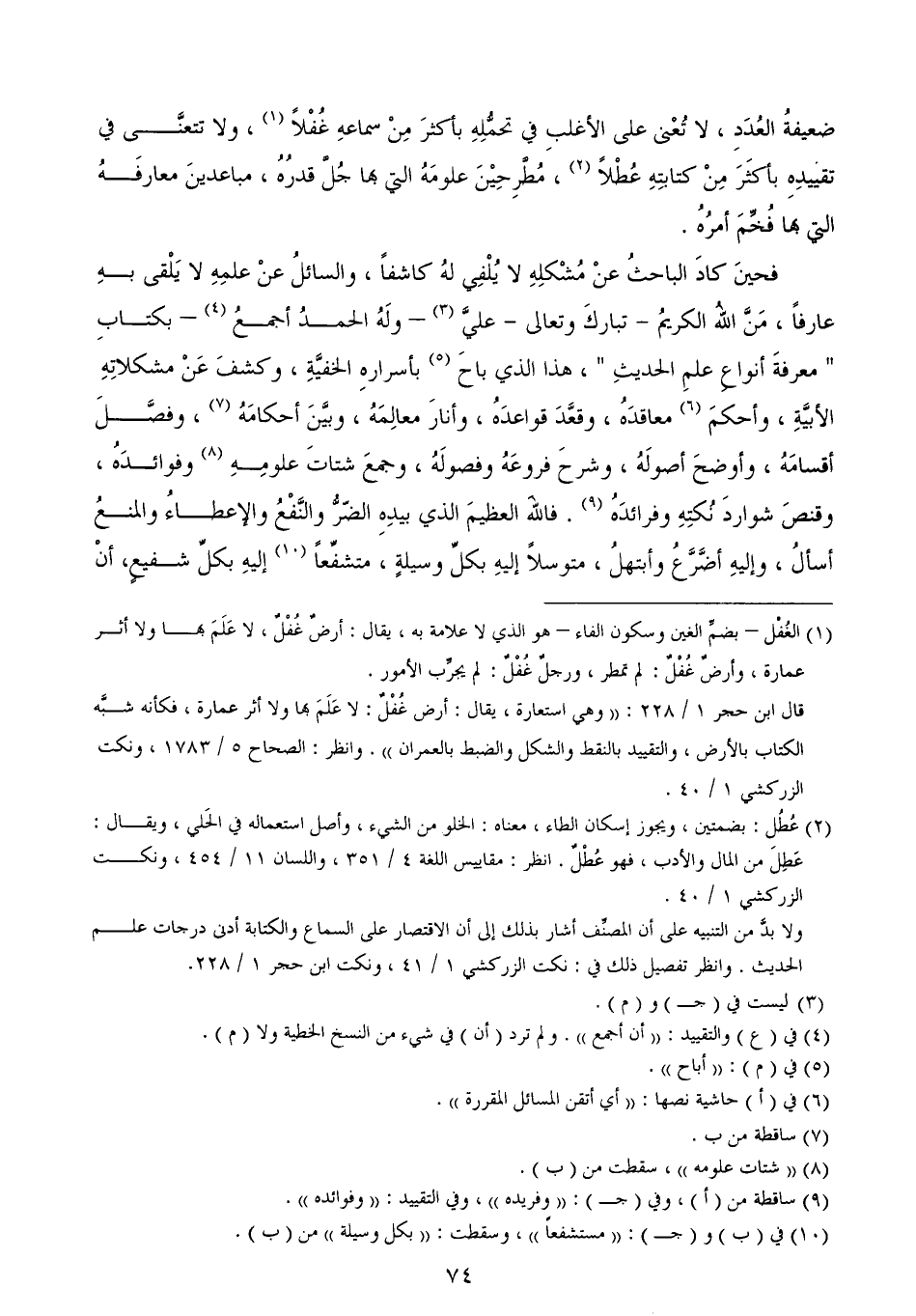 فحينَ كادَ الباحثُ عنْ مُشْكلِهِ لا يُلْفِي لهُ كاشفاً، والسائلُ عنْ علمِهِ لا يَلْقى بهِ عارفاً، مَنَّ اللهُ الكريمُ - تباركَ وتعالى - عليَّ (¬3) - ولَهُ الحمدُ أجمعُ (¬4) - بكتابِ ... " معرفةَ أنواعِ علمِ الحديثِ "، هذا الذي باحَ (¬5) بأسرارهِ الخفيَّةِ، وكشفَ عَنْ مشكلاتِهِ الأبيَّةِ، وأحكمَ (¬6) معاقدَهُ، وقعَّدَ قواعدَهُ، وأنارَ معالِمَهُ، وبيَّنَ أحكامَهُ (¬7)، وفصَّلَ أقسامَهُ، وأوضحَ أصولَهُ، وشرحَ فروعَهُ وفصولَهُ، وجمعَ شتاتَ علومِهِ (¬8) وفوائدَهُ، وقنصَ شواردَ نُكتِهِ وفرائدَهُ (¬9). فاللهَ العظيمَ الذي بيدِهِ الضّرُّ والنَّفْعُ والإعطاءُ والمنعُ أسألُ، وإليهِ أضَّرَّعُ وأبتهلُ، متوسلاً إليهِ بكلِّ وسيلةٍ، متشفِّعاً (¬10)) إليهِ بكلِّ شفيعٍ، أنْ