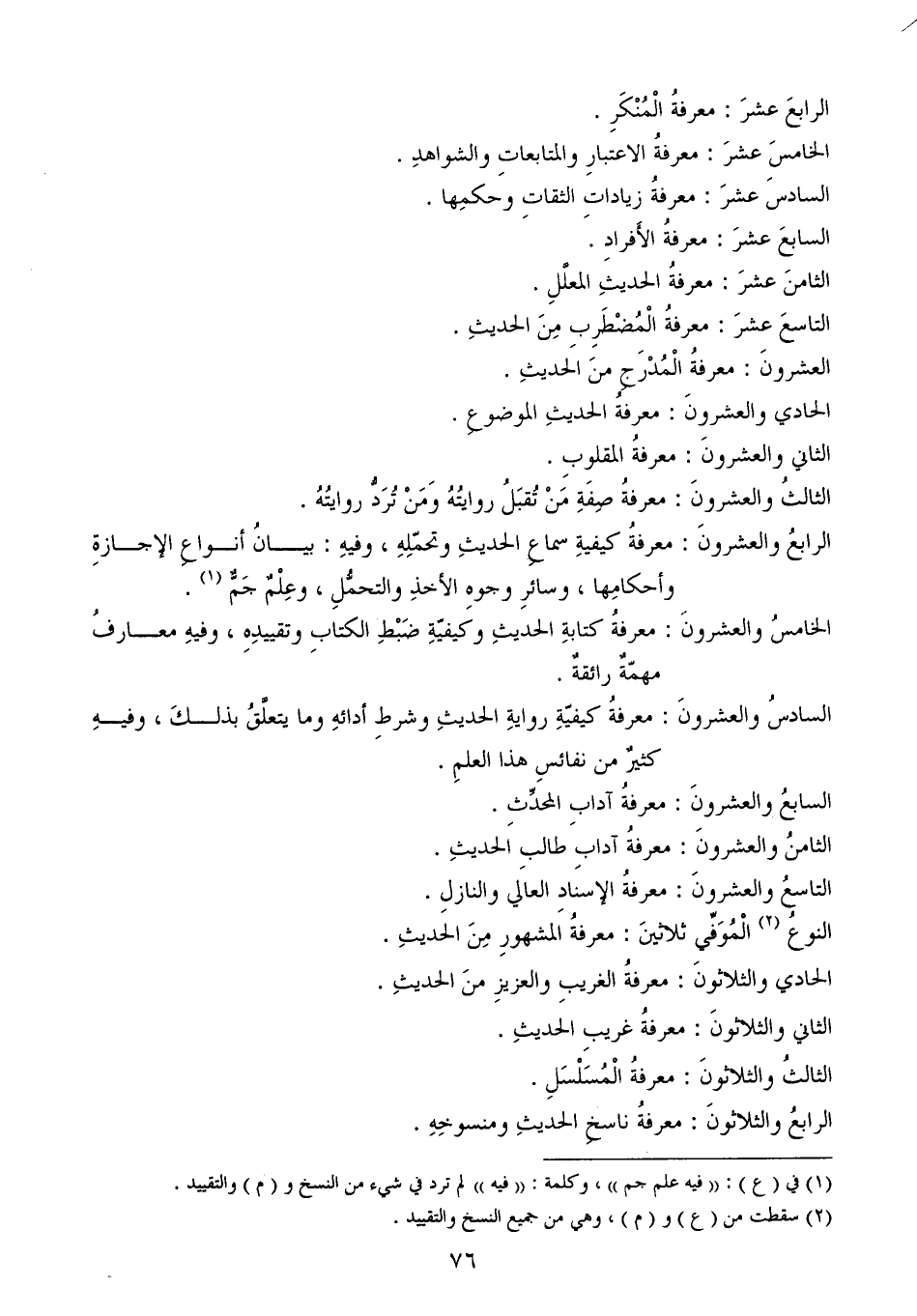 الخامسُ والعشرونَ: معرفةُ كتابةِ الحديثِ وكيفيّةِ ضَبْطِ الكتابِ وتقييدِهِ، وفيهِ معارفُ مهمّةٌ رائقةٌ.