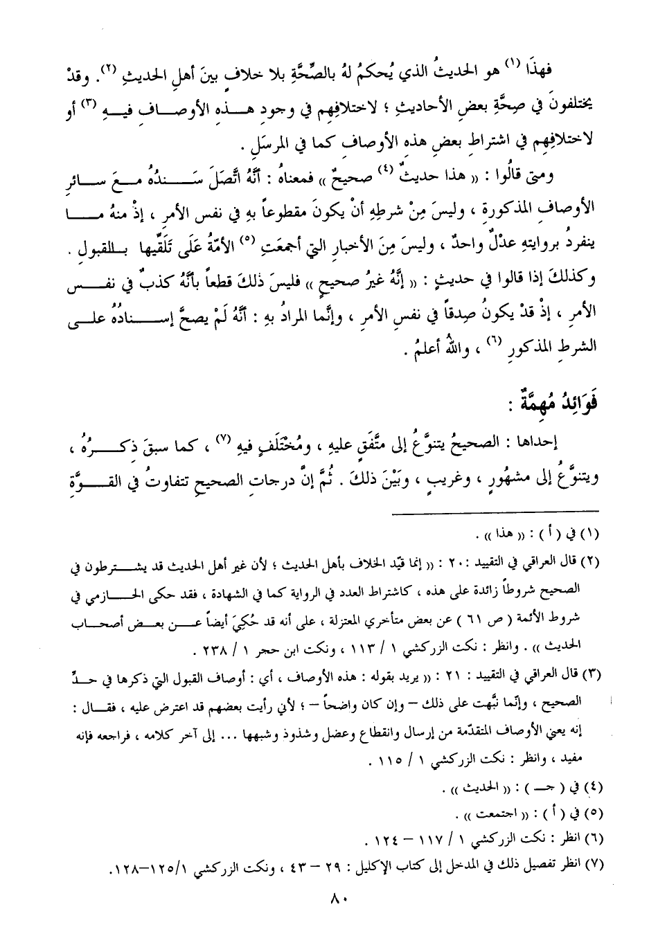 (¬3) قال العراقي في التقييد: 21: ((يريد بقوله: هذه الأوصاف، أي: أوصاف القبول التي ذكرها في حدِّ الصحيح، وإنّما نبَّهت على ذلك - وإن كان واضحاً -؛ لأني رأيت بعضهم قد اعترض عليه، فقال: إنه يعني الأوصاف المتقدّمة من إرسال وانقطاع وعضل وشذوذ وشبهها ... إلى آخر كلامه، فراجعه فإنه مفيد، وانظر: نكت الزركشي 1/ 115.