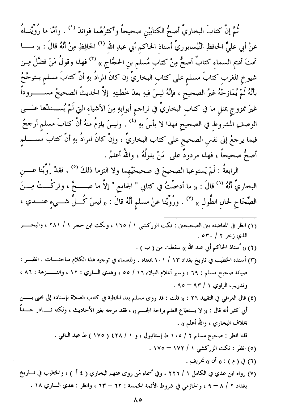 (¬1) انظر في المفاضلة بين الصحيحين: نكت الزركشي 1/ 165، ونكت ابن حجر 1/ 281، والبحر الذي زخر 2/ 530.