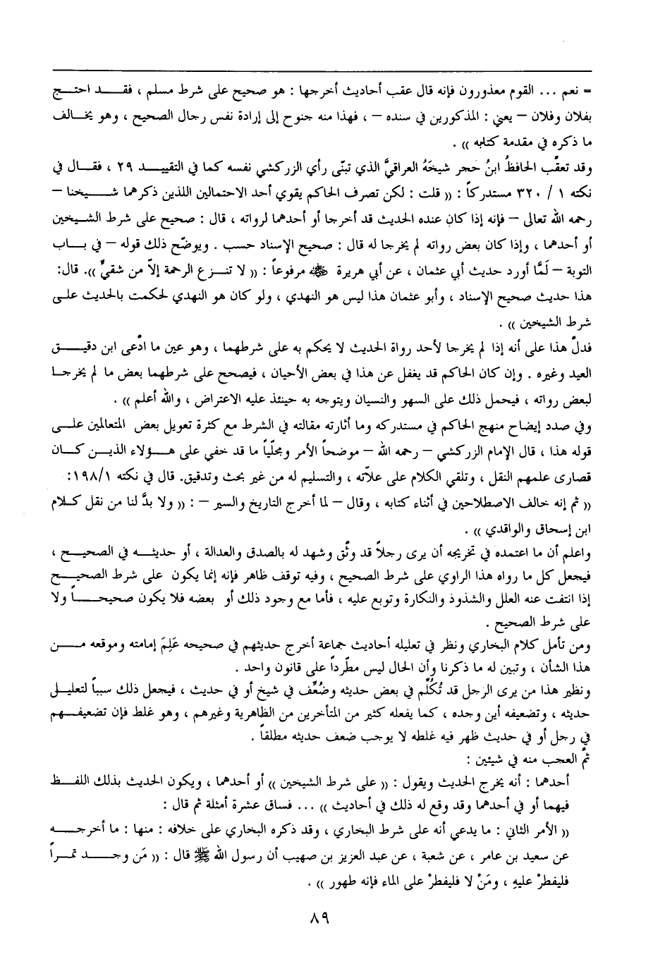 وفي صدد إيضاح منهج الحاكم في مستدركه وما أثارته مقالته في الشرط مع كثرة تعويل بعض المتعالمين على قوله هذا، قال الإمام الزركشي - رحمه الله - موضحاً الأمر ومجلّياً ما قد خفي على هؤلاء الذين كان قصارى علمهم النقل، وتلقي الكلام على علاّته، والتسليم له من غير بحث وتدقيق. قال في نكته 1/ 198: