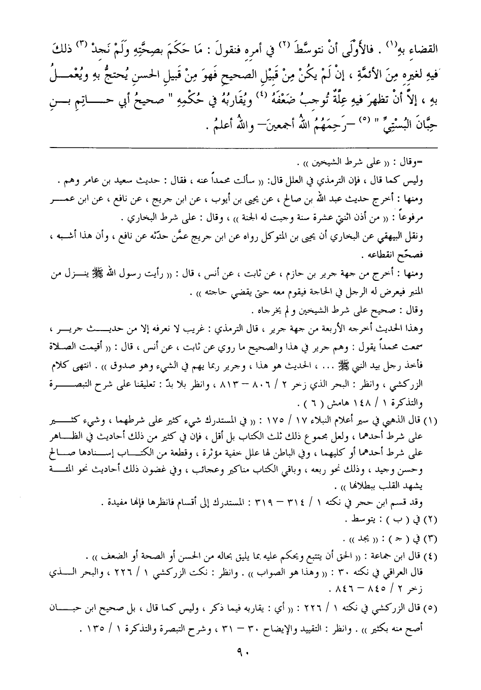 (¬5) قال الزركشي في نكته 1/ 226: ((أي: يقاربه فيما ذكر، وليس كما قال، بل صحيح ابن حبان أصح منه بكثير)). وانظر: التقييد والإيضاح 30 - 31، وشرح التبصرة والتذكرة 1/ 135.