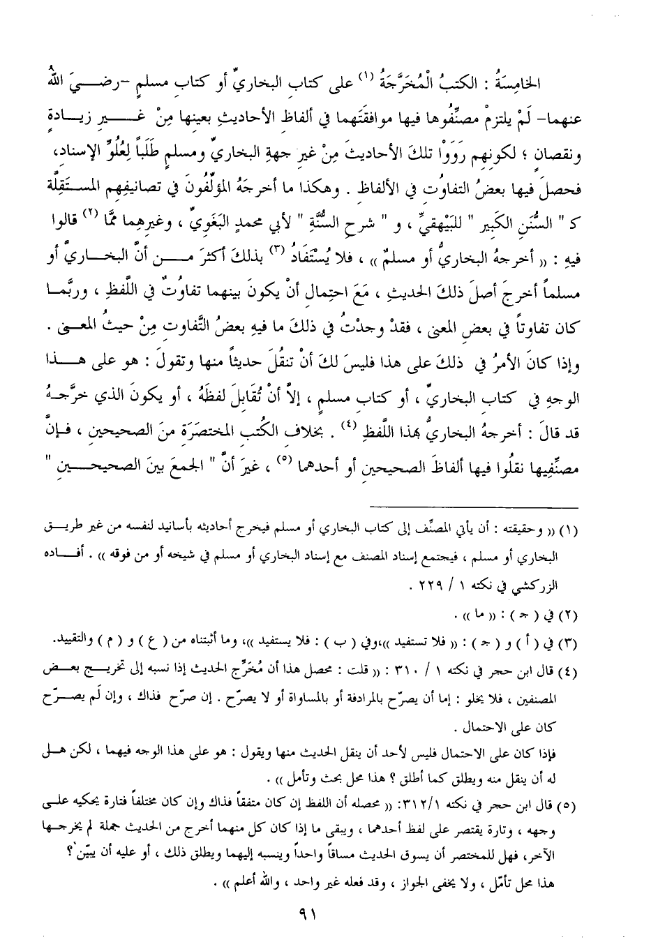 الخامِسَةُ: الكتبُ الْمُخَرَّجَةُ (¬1) على كتابِ البخاريِّ أو كتابِ مسلمٍ -رضيَ اللهُ عنهما- لَمْ يلتزمْ مصنِّفُوها فيها موافقَتَهما في ألفاظِ الأحاديثِ بعينِها مِنْ غيرِ زيادةٍ ونقصانٍ؛ لكونِهِم رَوَوْا تلكَ الأحاديثَ مِنْ غيرِ جهةِ البخاريِّ ومسلمٍ طَلَباً لِعُلُوِّ الإسنادِ، فحصلَ فيها بعضُ التفاوُتِ في الألفاظِ. وهكذا ما أخرجَهُ المؤلِّفُونَ في تصانيفِهِم المستَقِلَّة ك" السُّنَنِ الكَبِير " للبَيْهقيِّ، و " شرحِ السُّنَّةِ " لأبي محمدٍ البَغَوِيِّ، وغيرِهِما ممَّا (¬2) قالوا فيهِ: ((أخرجهُ البخاريُّ أو مسلمٌ))، فلا يُسْتَفَادُ (¬3) بذلكَ أكثرَ من أنَّ البخاريَّ أو مسلماً أخرجَ أصلَ ذلكَ الحديثِ، مَعَ احتِمالِ أنْ يكونَ بينهما تفاوُتٌ في اللَّفظِ، وربَّما كان تفاوتاً في بعضِ المعنى، فقدْ وجدْتُ في ذلكَ ما فيهِ بعضُ التَّفاوتِ مِنْ حيثُ المعنى. وإذا كانَ الأمرُ في ذلكَ على هذا فليسَ لكَ أنْ تنقُلَ حديثاً منها وتقولَ: هو على هذا الوجهِ في كتابِ البخاريِّ، أو كتابِ مسلمٍ، إلاَّ أنْ تُقَابِلَ لفظَهُ، أو يكونَ الذي خرَّجهُ قد قالَ: أخرجهُ البخاريُّ بهذا اللَّفظِ (¬4). بخلافِ الكُتبِ المختصَرَةِ منَ الصحيحينِ، فإنَّ مصنِّفِيها نقلُوا فيها ألفاظَ الصحيحينِ أو أحدهما (¬5)، غيرَ أنَّ " الجمعَ بينَ الصحيحينِ "