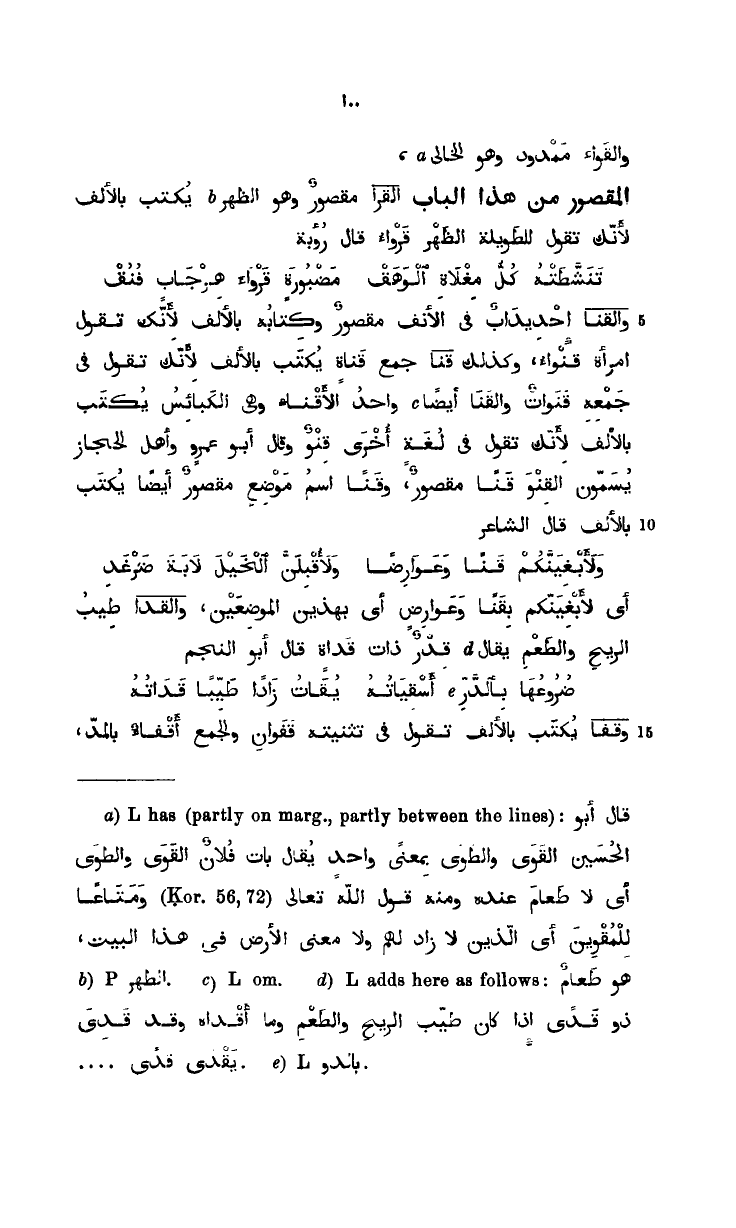 والقنا. إحديداب في الأنف مقصور وكتابه بالألف لأنك تقول امرأة قنواء وكذلك. قنا. جمع فناة يكتب بالألف لأنك تقول في جمعه قنوات. والقنا. أيضاً واحد الإقناء وهي الكبائس يكتب بالألف لأنك تقول في لغة أخرى فنو وقال أبو عمر وأهل الحجاز يسمون القنو قنا مقصور. قنا. اسم موضع مقصور أيضاً يكتب بالألف. . قال الشاعر: