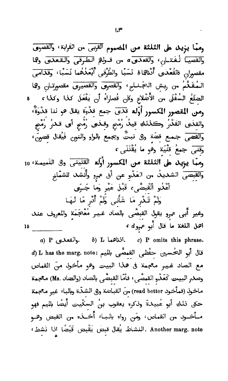 وغير أبي عمرو يقول القبصّي بالصاد غير معجمة والمعروف عند أهل اللغة ما قال أبو