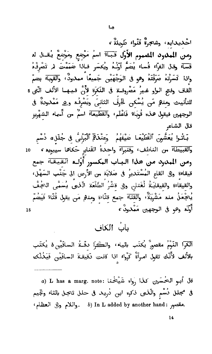 ومن الممدود من هذا الباب المكسور أوله. القيقاء. جمع قيقاءة وهي القاع المستدبر في صلابة من الأرض إلى جنب السهل. والقيقاء والقيقاية. لغتان وهي قشر الطلعة الذي يسمي الجفّ يجعل منه مشربة. والقثاء. جمع قثاءة ومنهم من يقول قثاء فيضم أوله وهو في الوجهين ممدود.