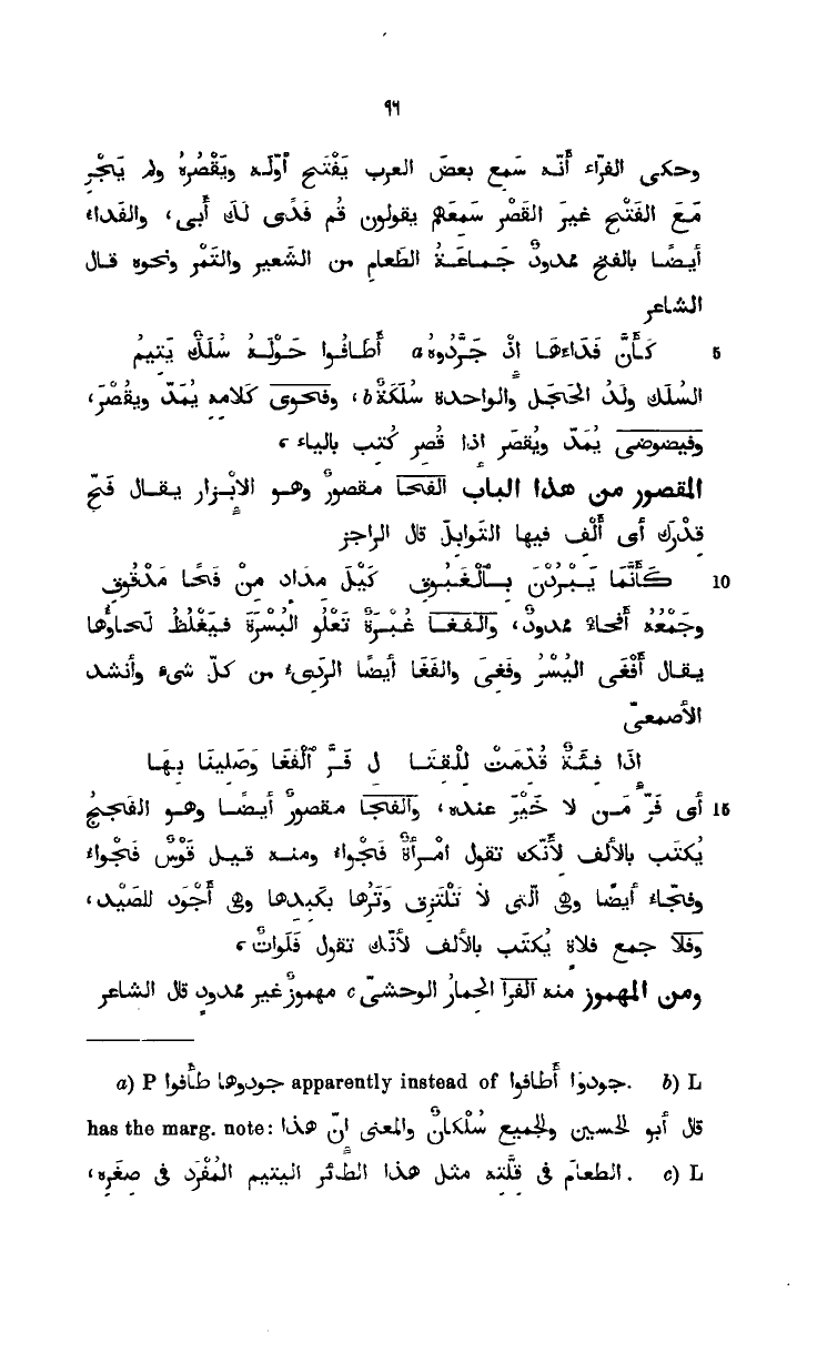 أي فرّ من لا خير عنده. والفجا. مقصور أيضاً وهو الفجج يكتب بالألف لأنك تقول امرأة فجواء ومنه قيل قوس نجوء وفجاء أيضاً وهي التي لا يلتزق وترها بكبدها وهي أجود للصيد. وفلا جمع فلاة يكتب بالألف لأنك تقول فلوات.