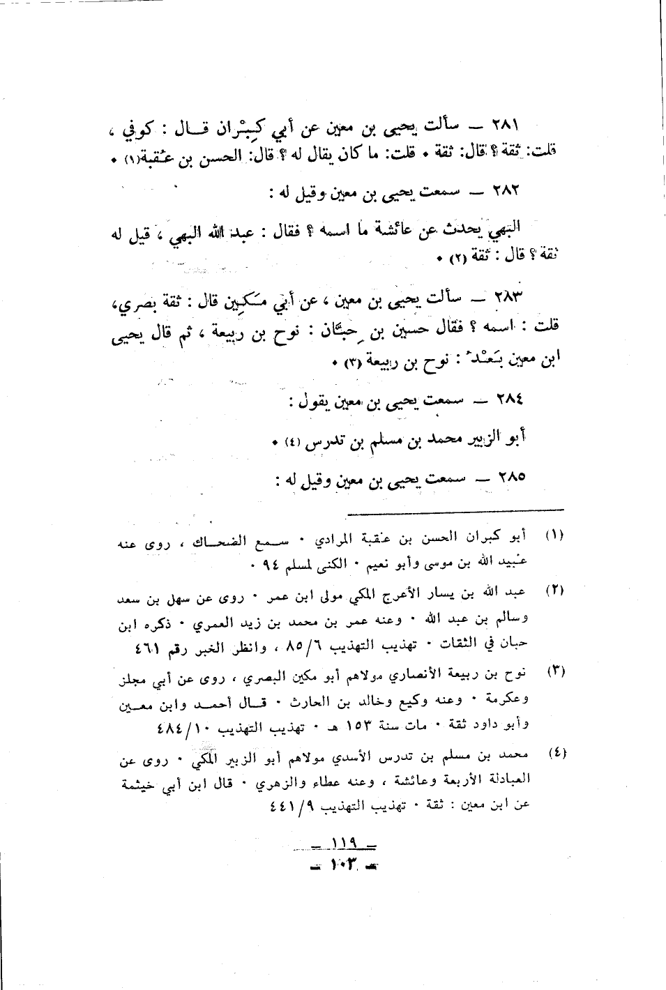 سألت يحيى بن معين عن ابى كبران قال كوفى قلت ثقة قال ثقة قلت ما كان يقال له الحسن بن عقبة سمعت يحيى بن معين وقيل له البهى يحدث عن عائشة ما اسمه فقال عبد الله البهى قيل له ثقة قال ثقة سألت يحيى بن معين عنابى مكين قال ثقة بصرى قلت اسمه فقال حسين بن حبان نوح بن ربيعة ثم قال يحيى ابن معين بعد نوح بن ربيعة سمعت يحيى بن معين ابو الزبير محمد بن مسلم بن تدرس سمعت يحيى بن معين وقيل له