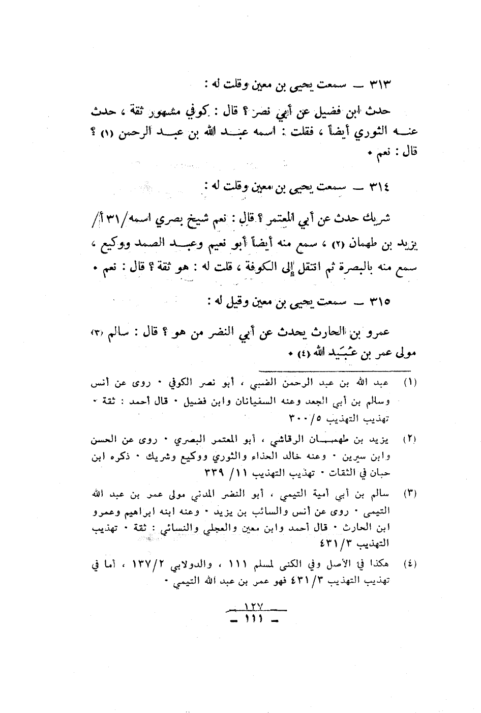 سمعت يحيى بن معين وقلت له حدث ابن فضل عن ابى نصر قال كوفى مشهور ثقة حدث عنه الثورى ايضا فقلت اسمه عبد الله بن عبد الرحمن قال نعم سمعت يحيى بن معين وقلت له شريك حدث عن ابى المعتمر قال نعم شيخ بصرى اسمه يزيد بن طهمان سمع منه ايضا ابو نعيم وعبد الصمد ووكيع سمع منه بالبصرة ثم انتقل الى الكوفة قلت له هو ثقة قال نعم سمعت يحيى بن معين وقيل له عمرو بن الحارث يحدث عن ابى النضر من هو قال سالم مولى عمر بن عبيد الله