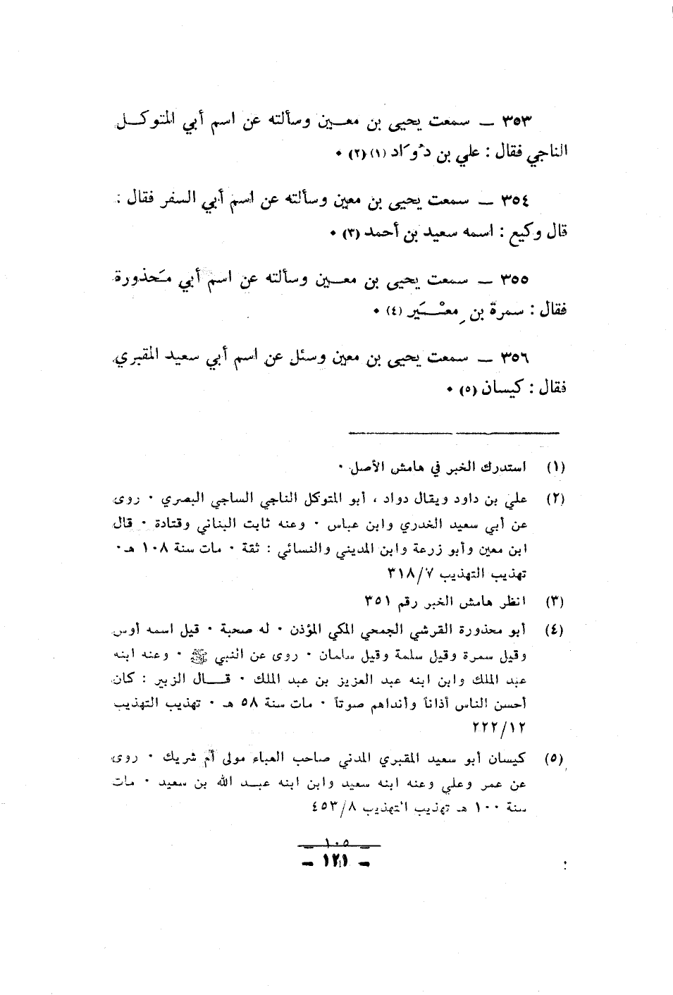سمعت يحيى بن معين وسألته عن اسم ابى المتوكل الناجى فقال على بن داود سمعت يحيى بن معين وسألته عن اسم ابى سفر فقال قال وكيع اسمه سعيد بن احمد سمعت يحيى بن معين وسألته عن اسم ابى محذورة فقال سمرة بن معيسر سمعت يحيى بن معين وسئل عن ابى سعيد المقبرى فقال كيسان