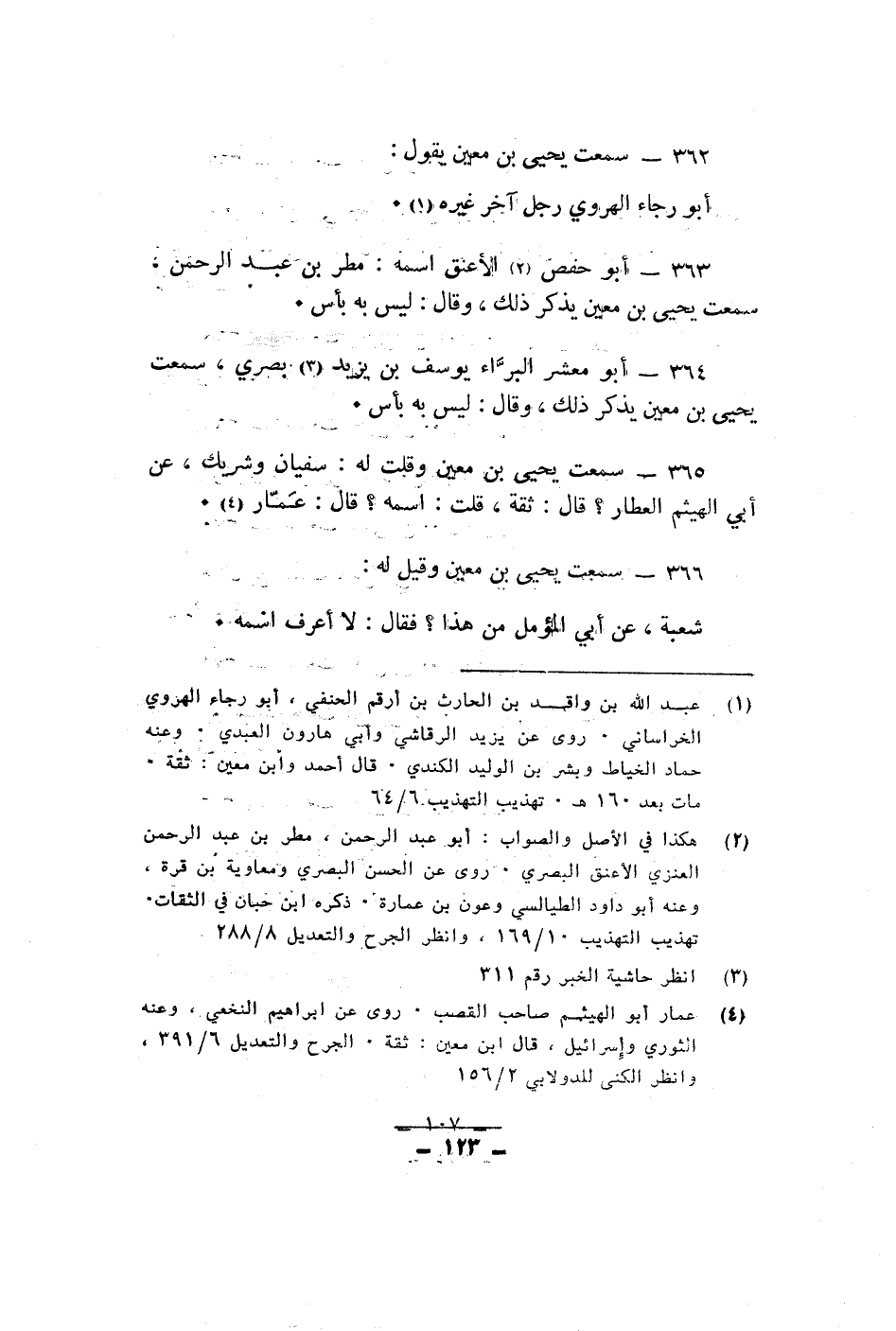 سمعت يحيى بن معين يقول أبو رجاء الهروي رجل غيره أبو حفص الأعتق اسمه مطر بن عبد الرحمن سمعت يحيى بن معين يذكر ذلك وقال ليس به بأس سمعت يحيى بن معين وقلت له سفيان وشريك عن أبي الهيثم العطار قال ثقة قلت اسمه قال عمار سمعت يحيى بن معين وقيل له شعبة عن أبي الؤمل من هذا فقال لا أعرف اسمه