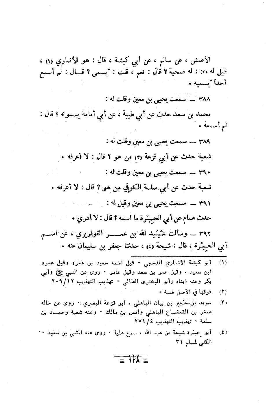 الاعمش عن سالم عن ابى كبشة قال هو الانمارى قيل له له صحبة قال نعم قلت يسمى قال لم اسمع احدا يسميه سمعت يحيى ين معين وقلت له محمد بن سعد عن ابى طيبة عن ابى امامة يسمونه قال لم اسمعه سمعت يحيى بن معين وقلت له شعبة حدث عن ابى قزعة من هو قال لا اعرفة سمعت يحيى بن معين وقيل له حدث همام عن ابى الحبرة ما اسمه قال لا ادرى وسأل عبيد الله بن عمير القواريرى عن اسم ابى الحبرة قال شيخة حدثنا جعفر بن سليمان هنه
