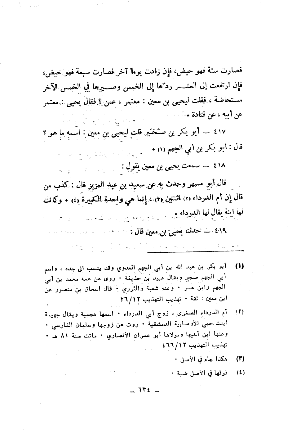 فصارت سته فهو حيض فان زادت يوما اخر فصارت سبعة فهو حيض فان ارتفعت الى العشر ردها الى الخمس وصيرها فى الخمس الآخر مستحاضة فقلت ليحيى بن معين معتمر عمن فقال يحيى معتمر عن ابيه عن قتادة ابو بكر بن صخير قلت ليحيى بن معين اسمه ما هو قال ابو بكر بن ابى الجهم سمعت يحيى بن معين يقول قال ابو مسهر وجدت به عن سعيد بن عبد العزيز قال كذب من قال ان ام الدرداء اثنتين انما هى واحدة الكبيرة وكانت لها اينة يقال لها الدرداء حدثنا يحيى بن معين قال
