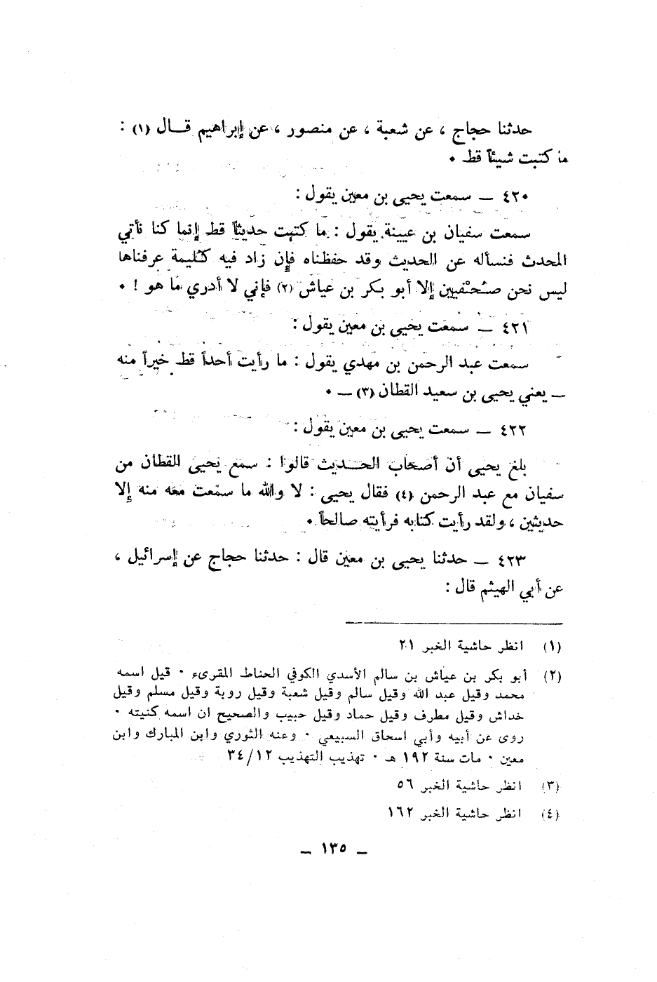 حدثنا حجاج عن شعبة عن منصور عن ابراهيم قال ما كتبت شيئا قط سمعت يحيى بن معين يقول سمعت سفيان بن عيينة يقول ما كتبت حديثا قط انما كنا نأتى المحدث وقد حفظناه فإن زاد فيه كليمة عرفناها ليس نحن صحيفين الا ابو بكر بن عياش فإنى لا أدرى ما هو سمعت يحيى بن معين يقول سمعت يحيى بن معين يقول سمعت عبد الرحمن بن مهدى يقول ما رأيت احدا قط خيرا منه يعنى يحيى بن سعيد القطان سمعت يحيى بن معين يقول بلغ يحيى ان اصحاب الحديث قالوا سمع يحيى القطان من سفيان مع عبد الرحمن فقال يحيى لا والله ما سمعت معه منه الا حدثين ولقد رأيته صالحا حدثنا يحيى بن معين قال حدثنا حجاج عن اسرائيل عن ابى الهيثم قال