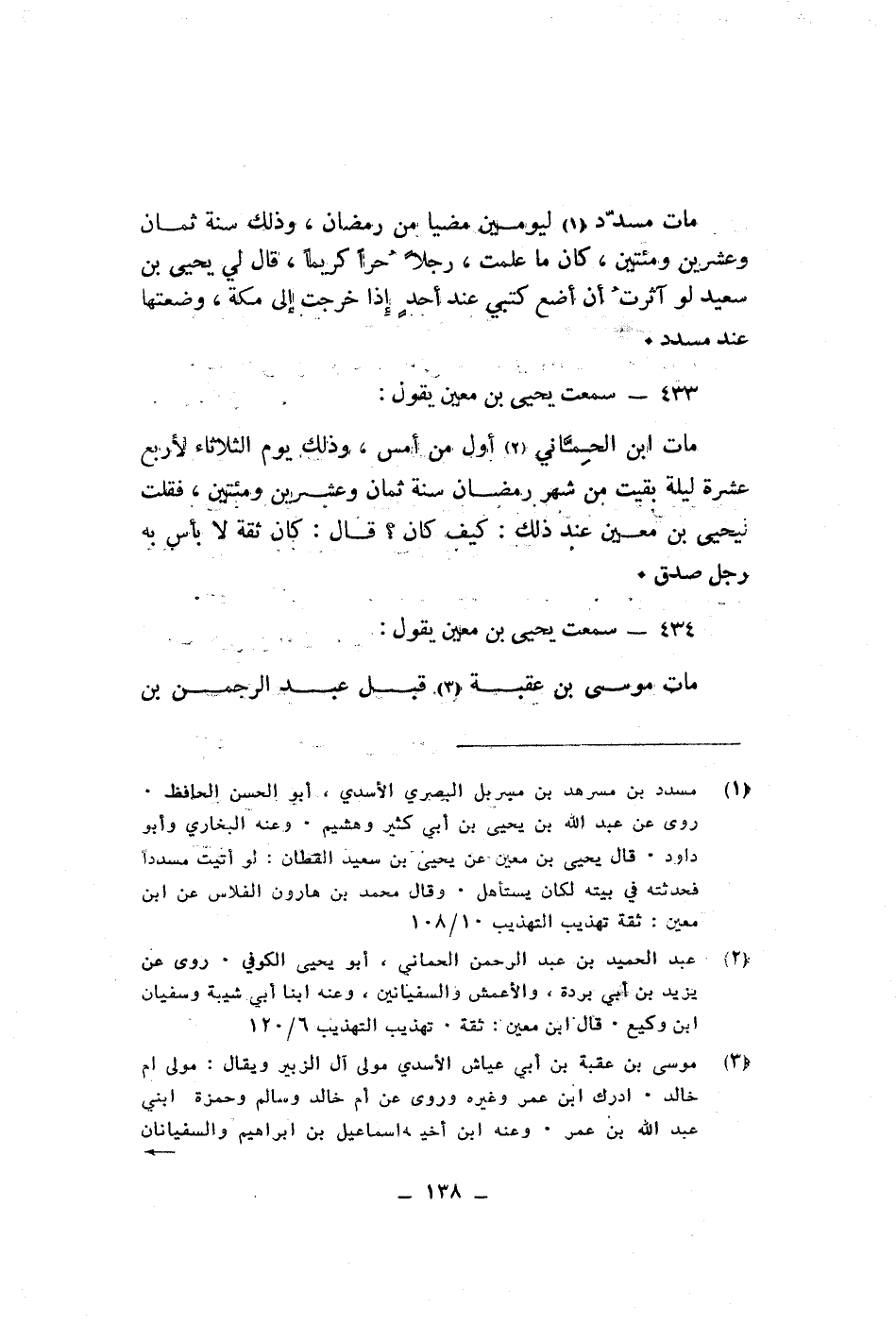 مات مسدد ليومين مضيا من رمضان وذلك سنة ثمان وعشرين ومئتين كان ماعملت رجلا حرا كريما قال لي يحيى بن سعيد لو أثرت أن أضع كتبي عند أحد إذ خرجت الى مكة وضعتها عند مسدد سمعت يحيى بن معين يقول مات ابن الحمانىاول من امس وزلك يوم الثلاثاء لاربع عشرة ليلة بقيت من شهر رمضان سنة ثمان وعشرين ومئتين فقلت ليحيى بن معين عند ذلك كيف كان قال كان بأس به رجل صدق سمعت يحيى بن معين يقول مات موسى بن عقبة قبل عبد الرحمن