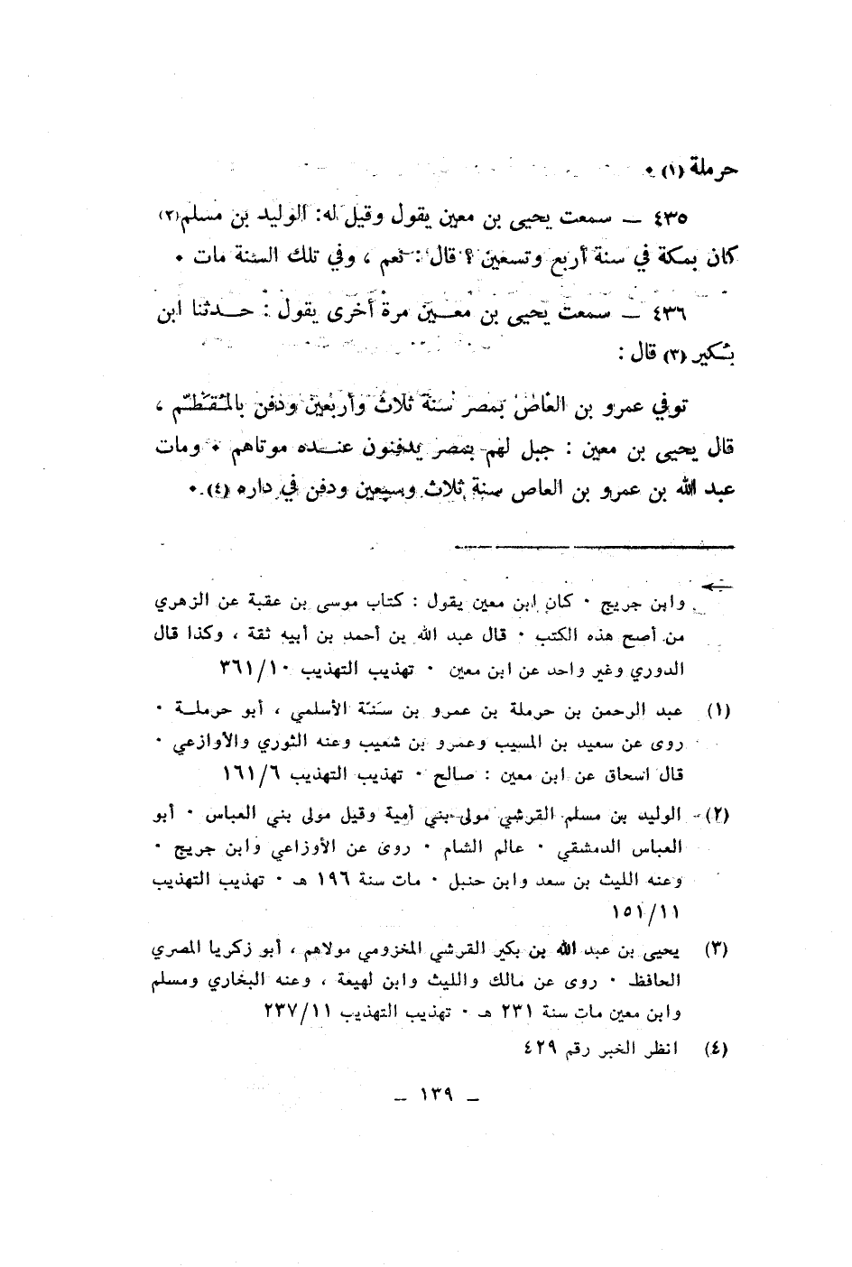 حرملة سمعت يحيى بن معين يقول وقيل له الوالدين بن مسلم كان بمكة في سنة أربع وتسعين قال نعم وفي تلك السنة مات سمعت يحيى بن معين مرة اخرى يقول حدثنا ابن بكير قال توفى عمرو بن العاص بمصر سنة ثلاث واربعين ودفن بالمسقظم قال يحيى بن معين جبل لهم بمصر يدفنون عنده موتاهم ومات عبد الله بن عمرو بن العاص سنة ثلاث وسبعين ودفن فى داره