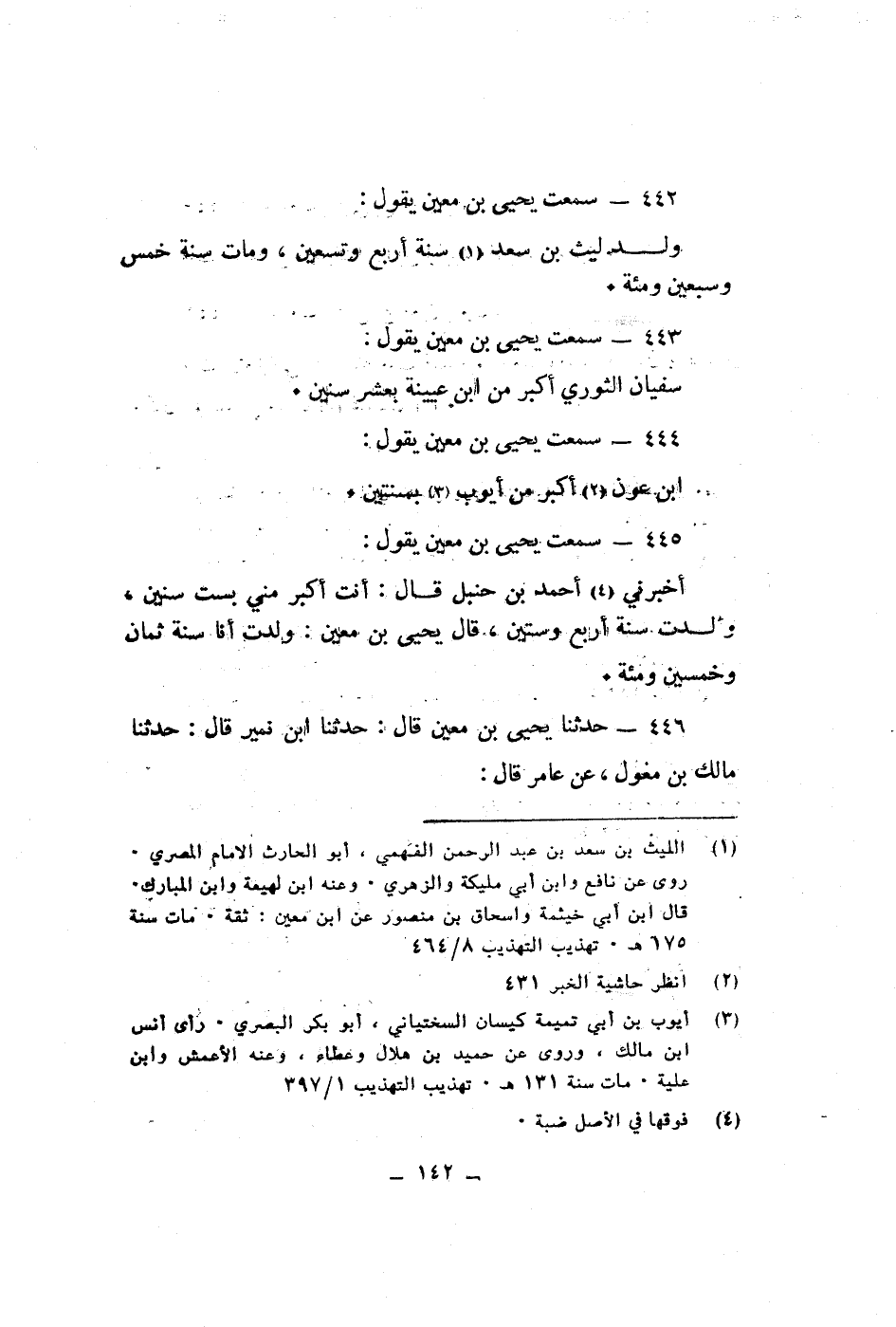 سمعت يحيى بن معين يقول ولد ليث بن سعد سنة اربع وتسعين ومات سنة خمس وسبعين مئة سمعت يحيى بن معين يقول سفيان الثورى اكبر من ابن عيينة بعشر سنين سمعت يحيى بن معين يقول ابن عون اكبر من ايوب بسنتين سمعت يحيى بن معين اخبرنى بن حنبل قال انت اكبر منى بست سنين ولد سنة اربع وستين قال يحيى بن معين ولدت وانا سنة ثمان وخمسين ومئة حدثنا يحيى بن معين قال حدثنا ابن نمير قال حدثنا مالك بن مغول عن عامر قال