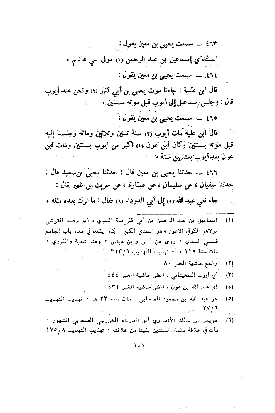 سمعت يحيى بن معين يقول السدى اسماعيل بن عبد الرحمن مولى بنى هاشم سمعت يحيى بن معين قال ابن علية جاءنا موت يحيى بن ابى كثير ونحن عند ايوب قال وجلس اسماعيل الى ايوب قبل موته بسنتين سمعت يحيى بن معين يقول قال ابن علية مات ايوب سنة ثنتين وثلاثين ومائة وجلسنا اليه قبل موته بسنتين وكان ابن عون اكبر من ايوب بسنتين ومات ابن عون بعد ايوب بعشرين سنة حدثنا يحيى بن معين قال حدثنا يحيى بن سعيد قال حدثنا سفيان عن سليمان عن عمارة عن حريث بن ظهير قال جاءنى عبد الله الى ابى الدرداء فقال ما ترك بعده مثله