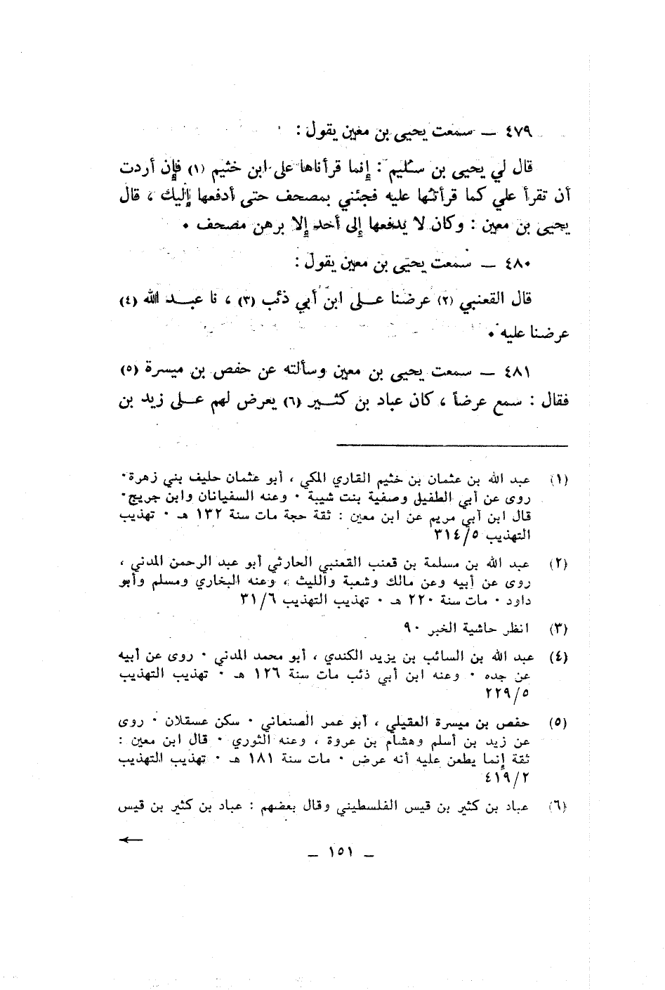 سمعت يحيى بن معين يقول قال لي يحيى بن سليم إنما قرأناها على ابن خثيم فإن أردت أن تقرأ على كما قرأتها عليه فجئنى بمصحف حتى ادفعها اليك قال يحيى بن معين وكان لا يدفعها الى احد الا برهن مصحف سمعت يحيى بن معين يقول قال القعنبى عرضنا على ابن ابى ذئب نا عبد الله عرضنا عليه سمعت يحيى بن معين وسألته عن حفص بن ميسرة فقال سمع عرضا كان عباد بن كثير يعرض لهم على زيد بن